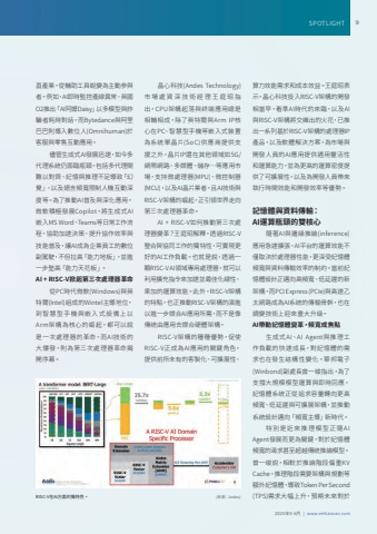 2025%u5e745-6%u6708 | www.eettaiwan.comSPOTLIGHT 9%u76f4%u7522%u696d%uff0c%u5f9e%u8f14%u52a9%u5de5%u5177%u86fb%u8b8a%u70ba%u4e3b%u52d5%u53c3%u8207%u8005%u3002%u4f8b%u5982%uff0cAI%u5373%u6642%u76e3%u63a7%u7522%u7dda%u7570%u5e38%u3001%u82f1%u570bO2%u63a8%u51fa%u300cAI%u963f%u5b24Daisy%u300d%u4ee5%u591a%u6a21%u578b%u8207%u8a50%u9a19%u8005%u8017%u6642%u5c0d%u8a71%uff0c%u800cBytedance%u8207%u963f%u91cc%u5df4%u5df4%u5247%u5c0e%u5165%u6578%u4f4d%u4eba(Omnihuman)%u65bc%u5ba2%u670d%u8207%u96f6%u552e%u4e92%u52d5%u61c9%u7528%u3002%u5118%u7ba1%u751f%u6210%u5f0fAI%u767c%u5c55%u8fc5%u901f%uff0c%u5982%u4eca%u591a%u4ee3%u7406%u7cfb%u7d71%u4ecd%u9762%u81e8%u74f6%u9838%uff0c%u5305%u62ec%u591a%u4ee3%u7406%u9593%u96e3%u4ee5%u5c0d%u9f4a%u3001%u8a18%u61b6%u8207%u63a8%u7406%u4e0d%u8db3%u5c0e%u81f4%u300c%u5e7b%u89ba%u300d%uff0c%u4ee5%u53ca%u8a9e%u8a00%u983b%u5bec%u9650%u5236%u4eba%u6a5f%u4e92%u52d5%u6df1%u5ea6%u7b49%u3002%u70ba%u4e86%u63a8%u52d5AI%u666e%u53ca%u8207%u6df1%u5316%u61c9%u7528%uff0c%u5fae%u8edf%u7a4d%u6975%u767c%u5c55Copilot%uff0c%u5c07%u751f%u6210%u5f0fAI%u5d4c%u5165MS Word%u3001Teams%u7b49%u65e5%u5e38%u5de5%u4f5c%u6d41%u7a0b%uff0c%u5354%u52a9%u52a0%u901f%u6c7a%u7b56%u3001%u63d0%u5347%u5354%u4f5c%u6548%u7387%u8207%u6280%u80fd%u666e%u53ca%uff0c%u8b93AI%u6210%u70ba%u4f01%u696d%u54e1%u5de5%u7684%u6578%u4f4d%u526f%u99d5%u99db%uff0c%u4e0d%u4f46%u62c9%u9ad8%u300c%u80fd%u529b%u5730%u677f%u300d%uff0c%u4e26%u9032%u4e00%u6b65%u588a%u9ad8%u300c%u80fd%u529b%u5929%u82b1%u677f%u300d%u3002AI + RISC-V%u6380%u8d77%u7b2c%u4e09%u6b21%u8655%u7406%u5668%u9769%u547d%u5f9ePC%u6642%u4ee3%u5fae%u8edf(Windows)%u8207%u82f1%u7279%u723e(Intel)%u7d44%u6210%u7684Wintel%u4e3b%u5c0e%u5730%u4f4d%uff0c%u5230%u667a%u6167%u578b%u624b%u6a5f%u8207%u5d4c%u5165%u5f0f%u8a2d%u5099%u4e0a%u4ee5Arm%u67b6%u69cb%u70ba%u6838%u5fc3%u7684%u5d1b%u8d77%uff0c%u90fd%u53ef%u4ee5%u8aaa%u662f%u4e00%u6b21%u8655%u7406%u5668%u7684%u9769%u547d%uff0c%u800cAI%u6280%u8853%u7684%u5927%u7206%u767c%uff0c%u5247%u70ba%u7b2c%u4e09%u6b21%u8655%u7406%u5668%u9769%u547d%u63ed%u958b%u5e8f%u5e55%u3002%u6676%u5fc3%u79d1%u6280(Andes Technology)%u5e02%u5834%u8655%u8cc7%u6df1%u6280%u8853%u7d93%u7406%u738b%u5ead%u662d%u6307%u51fa%uff0cCPU%u67b6%u69cb%u8d77%u843d%u8207%u7d42%u7aef%u61c9%u7528%u7e3d%u662f%u76f8%u8f14%u76f8%u6210%uff0c%u9664%u4e86%u82f1%u7279%u723e%u8207Arm IP%u6838%u5fc3%u5728PC%u3001%u667a%u6167%u578b%u624b%u6a5f%u7b49%u5d4c%u5165%u5f0f%u88dd%u7f6e%u70ba%u7cfb%u7d71%u55ae%u6676%u7247(SoC)%u4f9b%u61c9%u5546%u63d0%u4f9b%u652f%u63f4%u4e4b%u5916%uff0c%u6676%u7247IP%u9084%u5728%u5176%u4ed6%u9818%u57df%u59825G/%u7db2%u969b%u7db2%u8def%u3001%u591a%u5a92%u9ad4%u3001%u5132%u5b58%u2026%u7b49%u61c9%u7528%u5e02%u5834%uff0c%u652f%u6301%u5fae%u8655%u7406%u5668(MPU)%u3001%u5fae%u63a7%u5236%u5668(MCU)%uff0c%u4ee5%u53caAI%u6676%u7247%u696d%u8005%uff0c%u4e14AI%u6280%u8853%u8207RISC-V%u67b6%u69cb%u7684%u5d1b%u8d77%uff0c%u6b63%u5f15%u9818%u4e16%u754c%u8d70%u5411%u7b2c%u4e09%u6b21%u8655%u7406%u5668%u9769%u547d%u3002AI + RISC-V%u5982%u4f55%u63a8%u52d5%u7b2c%u4e09%u6b21%u8655%u7406%u5668%u8b8a%u9769%uff1f%u738b%u5ead%u662d%u89e3%u91cb%uff0c%u900f%u904eRISC-V%u6574%u5408%u8207%u5354%u540c%u5de5%u4f5c%u7684%u7368%u7279%u6027%uff0c%u53ef%u5be6%u73fe%u66f4%u597d%u7684AI%u5de5%u4f5c%u8ca0%u8f09%u3002%u4e5f%u5c31%u662f%u8aaa%uff0c%u900f%u904e%u4e00%u9846RISC-V AI%u9818%u57df%u5c08%u7528%u8655%u7406%u5668%uff0c%u5c31%u53ef%u4ee5%u5229%u7528%u64f4%u5145%u6307%u4ee4%u4f86%u52a0%u901f%u4e26%u6700%u4f73%u5316%u7dda%u6027%u3001%u4e58%u52a0%u7684%u904b%u7b97%u6548%u80fd%u3002%u6b64%u5916%uff0cRISC-V%u67b6%u69cb%u7684%u7279%u9ede%uff0c%u4e5f%u6b63%u63a8%u52d5RISC-V%u67b6%u69cb%u7684%u6f14%u9032%u4ee5%u9032%u4e00%u6b65%u5a92%u5408AI%u61c9%u7528%u6240%u9700%uff0c%u800c%u4e0d%u662f%u50cf%u50b3%u7d71%u7531%u61c9%u7528%u53bb%u5a92%u5408%u786c%u9ad4%u67b6%u69cb%u3002RISC-V%u67b6%u69cb%u7684%u7a2e%u7a2e%u512a%u52e2%uff0c%u4fc3%u4f7fRISC-V%u6b63%u6210%u70baAI%u61c9%u7528%u7684%u95dc%u9375%u89d2%u8272%uff0c%u63d0%u4f9b%u524d%u6240%u672a%u6709%u7684%u5ba2%u88fd%u5316%u3001%u53ef%u64f4%u5c55%u6027%u3001RISC-V%u5728AI%u65b9%u9762%u7684%u7368%u7279%u6027%u3002%u0009 %u0009 %u0009 %u0009 %u0009 (%u4f86%u6e90%uff1aAndes)%u7b97%u529b%u6548%u80fd%u9700%u6c42%u548c%u6210%u672c%u6548%u76ca%u3002%u738b%u5ead%u662d%u8868%u793a%uff0c%u6676%u5fc3%u79d1%u6280%u6295%u5165RISC-V%u67b6%u69cb%u7684%u958b%u767c%u76f8%u7576%u65e9%uff0c%u770b%u6e96AI%u6642%u4ee3%u7684%u4f86%u81e8%uff0c%u4ee5%u53caAI%u8207RISC-V%u67b6%u69cb%u5c07%u4ea4%u7e54%u51fa%u7684%u706b%u82b1%uff0c%u5df2%u63a8%u51fa%u4e00%u7cfb%u5217%u57fa%u65bcRISC-V%u67b6%u69cb%u7684%u8655%u7406%u5668IP%u7522%u54c1%uff0c%u4ee5%u53ca%u8edf%u9ad4%u89e3%u6c7a%u65b9%u6848%uff0c%u70ba%u5e02%u5834%u8207%u958b%u767c%u4eba%u54e1%u7684AI%u61c9%u7528%u63d0%u4f9b%u901a%u7528%u9748%u6d3b%u6027%u548c%u904b%u7b97%u80fd%u529b%uff0c%u4e26%u70ba%u66f4%u9ad8%u7684%u904b%u7b97%u5bc6%u5ea6%u63d0%u4f9b%u4e86%u53ef%u64f4%u5c55%u6027%uff0c%u4ee5%u53ca%u70ba%u958b%u767c%u4eba%u54e1%u5e36%u4f86%u57f7%u884c%u6642%u9593%u6548%u80fd%u548c%u958b%u767c%u6548%u7387%u7b49%u512a%u52e2%u3002%u8a18%u61b6%u9ad4%u8207%u8cc7%u6599%u50b3%u8f38%uff1aAI%u904b%u7b97%u74f6%u9838%u7684%u96d9%u6838%u5fc3%u96a8%u8457AI%u8207%u908a%u7de3%u63a8%u8ad6(inference)%u61c9%u7528%u6025%u901f%u64f4%u5f35%uff0cAI%u5e73%u53f0%u7684%u904b%u7b97%u6548%u80fd%u4e0d%u50c5%u53d6%u6c7a%u65bc%u8655%u7406%u5668%u6027%u80fd%uff0c%u66f4%u6df1%u53d7%u8a18%u61b6%u9ad4%u983b%u5bec%u8207%u8cc7%u6599%u50b3%u8f38%u6548%u7387%u7684%u5236%u7d04%u3002%u7576%u524d%u8a18%u61b6%u9ad4%u8a2d%u8a08%u6b63%u9081%u5411%u9ad8%u983b%u5bec%u3001%u4f4e%u5ef6%u9072%u7684%u65b0%u67b6%u69cb%uff0c%u800cPCI Express (PCIe)%u8207%u9ad8%u901f%u4e59%u592a%u7db2%u8def%u6210%u70baAI%u7cfb%u7d71%u7684%u50b3%u8f38%u9aa8%u5e79%uff0c%u4e5f%u5728%u8abf%u8b8a%u6280%u8853%u4e0a%u8fce%u4f86%u91cd%u5927%u5347%u7d1a%u3002AI%u5e36%u52d5%u8a18%u61b6%u9ad4%u8b8a%u9769%uff0c%u983b%u5bec%u6210%u7126%u9ede%u751f%u6210%u5f0fAI%u3001AI Agent%u8207%u63a8%u7406%u5de5%u4f5c%u8ca0%u8f09%u7684%u