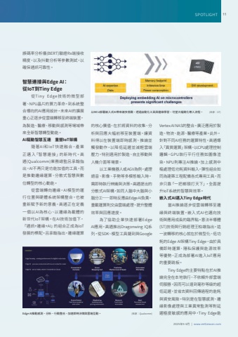 2025%u5e745-6%u6708 | www.eettaiwan.comSPOTLIGHT 11Edge AI%u63a8%u52d5%u611f%u6e2c%u3001%u5206%u6790%u3001%u884c%u52d5%u6574%u5408%uff0c%u52a0%u901f%u5373%u6642%u6c7a%u7b56%u8207%u96f2%u7aef%u4e92%u52d5%u3002%u0009 %u0009 (%u4f86%u6e90%uff1aQualcomm)%u8aa4%u78bc%u7387%u5206%u6790%u5100(BERT)%u9a57%u8b49Rx%u7aef%u63a5%u6536%u7cbe%u5ea6%uff0c%u4ee5%u53ca%u6296%u52d5%u5206%u6790%u7b49%u53c3%u6578%u6e2c%u8a66%uff0c%u4ee5%u78ba%u4fdd%u901a%u8a0a%u53ef%u9760%u6027%u3002%u667a%u6167%u9023%u63a5%u8207Edge AI%uff1a%u5f9eIoT%u5230Tiny Edge%u5f9eTiny Edge%u6280%u8853%u7684%u5fae%u578b%u90e8%u7f72%u3001NPU%u6676%u7247%u7684%u7b97%u529b%u9769%u547d%uff0c%u5230%u7cfb%u7d71%u6574%u5408%u5c0e%u5411%u7684AI%u61c9%u7528%u8a2d%u8a08%uff0c%u672a%u4f86AI%u7684%u64f4%u5c55%u91cd%u5fc3%u6b63%u9010%u6b65%u5f9e%u96f2%u7aef%u8f49%u79fb%u81f3%u7d42%u7aef%u88dd%u7f6e%uff0c%u70ba%u88fd%u9020%u3001%u91ab%u7642%u3001%u79fb%u52d5%u8207%u611f%u6e2c%u7b49%u5834%u57df%u5e36%u4f86%u5168%u65b0%u667a%u6167%u8f49%u578b%u52d5%u80fd%u3002AI%u9a45%u52d5%u667a%u6167%u4e92%u9023%u3000%u91cd%u5851IoT%u67b6%u69cb%u96a8%u8457AI%u548cIoT%u5feb %u901f%u878d%u5408%uff0c%u7522%u696d%u6b63 %u9081 %u5165%u300c%u667a%u6167 %u9023%u63a5 %u300d%u7684%u65b0%u6642%u4ee3%u3002%u9ad8%u901a(Qualcomm)%u696d%u52d9%u7e3d%u76e3%u5442%u627f%u7ff0%u6307%u51fa%uff0cAI%u4e0d%u518d%u53ea%u662f%u529f%u80fd%u52a0%u503c%u7684%u5de5%u5177%uff0c%u800c%u662f%u63a8%u52d5%u908a%u7de3%u904b%u7b97%u3001%u5206%u6563%u5f0f%u667a%u6167%u8207%u6578%u4f4d%u8f49%u578b%u7684%u6838%u5fc3%u52d5%u80fd%u3002%u5f9e%u96f2%u7aef%u8f49%u5411%u908a%u7de3%uff0cAI%u6a21%u578b%u7684%u904b%u884c%u4f4d%u7f6e%u8207%u786c%u9ad4%u7cfb%u7d71%u67b6%u69cb%u6574%u5408%uff0c%u4e5f%u88ab%u91cd%u65b0%u8ce6%u4e88%u65b0%u7684%u610f%u7fa9%uff0c%u9ad8%u901a%u6b63%u5728%u5b9a%u7fa9%u4e00%u500b%u4ee5AI%u70ba%u6838%u5fc3%u3001%u4ee5%u908a%u7de3%u70ba%u8f09%u9ad4%u7684%u65b0%u4e16%u4ee3IoT%u67b6%u69cb%u3002%u5728AI%u6280%u8853%u52a0%u503c%u4e0b%uff0c%u300c%u901a%u8a0a+%u908a%u7de3+AI%u300d%u7684%u7d44%u5408%u6b63%u6210%u70baIoT%u767c%u5c55%u7684%u6a19%u914d%u3002%u5442%u627f%u7ff0%u6307%u51fa%uff0c%u908a%u7de3%u904b%u7b97%u7684%u6838%u5fc3%u50f9%u503c%uff0c%u5728%u65bc%u5c07%u8cc7%u6599%u7684%u6536%u96c6%u3001%u5206%u6790%u8207%u56de%u61c9%u5927%u5e45%u524d%u79fb%u81f3%u88dd%u7f6e%u7aef%uff0c%u8b93%u8cc7%u6599%u5f97%u4ee5%u5728%u88dd%u7f6e%u7aef%u5373%u6642%u611f%u6e2c%u3001%u63a8%u8ad6%u4e26%u89f8%u767c%u52d5%u4f5c%uff0c%u4ee5%u964d%u4f4e%u5ef6%u9072%u4e26%u6e1b%u8f15%u96f2%u7aef%u58d3%u529b%uff0c%u7279%u5225%u9069%u7528%u65bc%u88fd%u9020%u3001%u81ea%u4e3b%u79fb%u52d5%u8207%u4eba%u6a5f%u4ecb%u9762%u7b49%u5834%u666f%u3002%u4ee5%u5de5%u696d%u6a5f%u5668%u4eba%u6216AGV%u70ba%u4f8b%uff0c%u8655%u7406%u8a9e%u97f3%u3001%u5f71%u50cf%u3001%u624b%u52e2%u7b49%u591a%u6a21%u614b%u8f38%u5165%u6642%uff0c%u9700%u5373%u6642%u57f7%u884c%u8fa8%u8b58%u8207%u6c7a%u7b56%u3002%u9ad8%u901a%u63d0%u51fa%u7684%u5206%u6563%u5f0fAI%u67b6%u69cb%uff0c%u5982%u540c%u4eba%u8166%u4e2d%u5927%u8166%u8207%u5c0f%u8166%u5206%u5de5%u2014%u2014%u5373%u6642%u53cd%u61c9%u7531Edge AI%u8ca0%u8cac%uff0c%u91cd%u8f09%u904b%u7b97%u5247%u4ea4%u7531%u96f2%u7aef%u8655%u7406%uff0c%u63d0%u5347%u6574%u9ad4%u6548%u7387%u8207%u56de%u61c9%u901f%u5ea6%u3002%u70ba%u4e86%u5354%u52a9%u4f01%u696d%u5feb %u901f%u90e8%u7f72Edge AI%u61c9%u7528%uff0c%u9ad8%u901a%u63a8%u51faDragonwing IQ%u7cfb%u5217%uff0c%u5f9eSDK%u3001%u6a21%u578b%u5de5%u5177%u93c8%u5230%u8207Google %u4ee5MCU%u90e8%u7f72%u5d4c%u5165%u5f0fAI%u5e36%u4f86%u8af8%u591a%u6311%u6230%uff0c%u900f%u904e%u81ea%u52d5%u5316%u5de5%u5177%u8207%u908a%u7de3%u5b78%u7fd2%uff0c%u53ef%u671b%u5927%u5e45%u7c21%u5316%u5c0e%u5165%u6d41%u7a0b%u3002%u0009 (%u4f86%u6e90%uff1aST)Vertex AI NAS%u7684%u6574%u5408%uff0c%u5ee3%u6cdb%u61c9%u7528%u65bc%u88fd%u9020%u3001%u7269%u6d41%u3001%u80fd%u6e90%u3001%u91ab%u7642%u7b49%u7522%u696d%u3002%u6b64%u5916%uff0c%u91dd%u5c0d%u4e0d%u540cAI%u4efb%u52d9%u7684%u904b%u7b97%u7279%u6027%uff0c%u9ad8%u901a%u5c0e%u5165%u300c%u7570%u8cea%u904b%u7b97%u300d%u67b6%u69cb%uff0c%u4ee5CPU%u8655%u7406%u63a7%u5236%u908f%u8f2f%uff0cGPU%u57f7%u884c%u5e73%u884c%u4efb%u52d9%u5982%u5716%u50cf%u6e32%u67d3%uff0cNPU%u5247%u5c08%u6ce8AI%u63a8%u8ad6%uff0c%u52a0%u4e0a%u611f%u6e2c%u4e2d%u6a1e%u8655%u7406%u4f4e%u529f%u8017%u8cc7%u6599%u8f38%u5165%uff0c%u5f48%u6027%u7d44%u5408%u5982%u540c%u70ba%u5efa%u7bc9%u5de5%u7a0b%u914d%u5099%u5404%u5f0f%u5c08%u7528%u5de5%u5177%uff0c%u800c%u975e%u53ea%u9760%u300c%u4e00%u628a%u6994%u982d%u6253%u5929%u4e0b%u300d%uff0c%u5168%u9762%u63d0%u5347IoT%u7cfb%u7d71%u7684%u667a%u6167%u8207%u6548%u7387%u3002%u5d4c%u5165%u5f0fAI%u9081%u5165Tiny Edge%u6642%u4ee3%u7576AI%u63a8%u8ad6%u9010%u6b65%u5f9e%u96f2%u7aef%u8f49%u79fb%u81f3%u908a%u7de3%u8207%u7d42%u7aef%u88dd%u7f6e%uff0c%u5d4c%u5165%u5f0fAI%u4e5f%u9081%u5411%u6280%u8853%u8207%u61c9%u7528%u6210%u9577%u7684%u81e8%u754c%u9ede%u3002%u610f%u6cd5%u534a%u5c0e%u9ad4(ST)%u6280%u8853%u8207%u884c%u92b7%u7d93%u7406%u738b%u67cf%u96c4%u6307%u51fa%uff0c%u9019%u4e00%u6ce2%u8f49%u79fb%u7684%u6838%u5fc3%u5c31%u5728%u65bc%u5fae%u578b%u5316%u3001%u4f4e%u529f%u8017%u7684Edge AI%u67b6%u69cbTiny Edge%uff0c%u7531%u65bc%u5177%u5099%u5373%u6642%u904b%u7b97%u3001%u96b1%u79c1%u4fdd%u8b77%u8207%u80fd%u6e90%u6548%u7387%u7b49%u512a%u52e2%uff0c%u6b63%u6210%u70ba%u90e8%u7f72AI%u9032%u5165IoT%u61c9%u7528%u7684%u91cd%u8981%u8df3%u677f%u3002Tiny Edge%u7684%u4e3b%u8981%u7279%u9ede%u5728%u65bcAI%u63a8%u8ad6%u5b8c%u5168%u5728%u672c%u5730%u57f7%u884c%uff0c%u4e0d%u4f9d%u8cf4%u5916%u90e8%u96f2%u7aef%u4f3a%u670d%u5668%uff0c%u56e0%u800c%u53ef%u4ee5%u9054%u5230%u6beb%u79d2%u7b49%u7d1a%u7684%u8d85%u4f4e%u5ef6%u9072%uff0c%u4e26%u7701%u53bb%u8cc7%u6599%u56de%u50b3%u904e%u7a0b%u7684%u80fd%u8017%u8207%u8cc7%u5b89%u98a8%u96aa%u3002%u7279%u5225%u662f%u5728%u667a%u6167%u611f%u6e2c%u3001%u908a%u7de3%u5f71%u50cf%u8655%u7406%u8207%u5de5%u696d%u7570%u5e38%u76e3%u6e2c%u7b49%u5c0d%u5ef6%u9072%u6975%u5ea6%u654f%u611f%u7684%u61c9%u7528%u4e2d%uff0cTiny Edge%u80fd