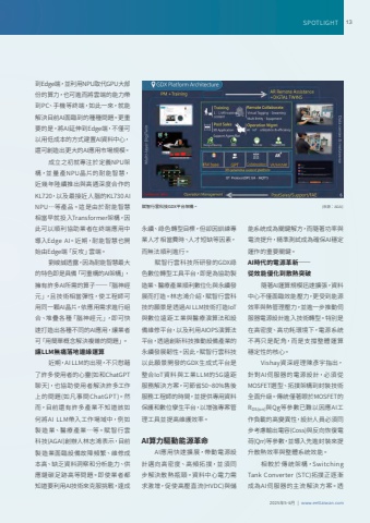 2025%u5e745-6%u6708 | www.eettaiwan.comSPOTLIGHT 13%u5230Edge%u7aef%uff0c%u4e26%u5229%u7528NPU%u53d6%u4ee3GPU%u5927%u90e8%u4efd%u7684%u7b97%u529b%uff0c%u4e5f%u53ef%u9032%u800c%u5c07%u96f2%u7aef%u7684%u80fd%u529b%u5e36%u5230PC%u3001%u624b%u6a5f%u7b49%u7d42%u7aef%uff0c%u5982%u6b64%u4e00%u4f86%uff0c%u5c31%u80fd%u89e3%u6c7a%u76ee%u524dAI%u9762%u81e8%u5230%u7684%u7a2e%u7a2e%u554f%u984c%u3002%u66f4%u91cd%u8981%u7684%u662f%uff0c%u5c07AI%u5ef6%u4f38%u5230Edge%u7aef%uff0c%u4e0d%u50c5%u53ef%u4ee5%u7528%u4f4e%u6210%u672c%u7684%u65b9%u5f0f%u5efa%u7f6eAI%u8cc7%u6599%u4e2d%u5fc3%uff0c%u9084%u53ef%u5275%u9020%u51fa%u66f4%u5927%u7684AI%u61c9%u7528%u5e02%u5834%u898f%u6a21%u3002%u6210%u7acb%u4e4b%u521d%u5c31%u5c08%u6ce8%u65bc%u5b9a%u7fa9NPU%u67b6%u69cb%uff0c%u4e26%u91cf%u7522NPU%u6676%u7247%u7684%u8010%u80fd%u667a%u6167%uff0c%u8fd1%u5e7e%u5e74%u9678%u7e8c%u63a8%u51fa%u8207%u9ad8%u901a%u6df1%u5ea6%u5408%u4f5c%u7684KL720%uff0c%u4ee5%u53ca%u6700%u63a5%u8fd1%u4eba%u8166%u7684KL730 AI NPU%u2026%u7b49%u7522%u54c1%u3002%u9019%u662f%u7531%u65bc%u8010%u80fd%u667a%u6167%u76f8%u7576%u65e9%u5c31%u6295%u5165Transformer%u67b6%u69cb%uff0c%u56e0%u6b64%u53ef%u4ee5%u9806%u5229%u5354%u52a9%u696d%u8005%u5728%u7d42%u7aef%u61c9%u7528%u4e2d%u5c0e%u5165Edge AI%u3002%u8fd1%u671f%uff0c%u8010%u80fd%u667a%u6167%u4e5f%u958b%u59cb%u7531Edge%u7aef%u300c%u53cd%u653b%u300d%u96f2%u7aef%u3002%u5289%u5cfb%u8aa0%u900f%u9732%uff0c%u56e0%u70ba%u8010%u80fd%u667a%u6167%u6700%u5927%u7684%u7279%u8272%u5373%u662f%u5177%u5099%u300c%u53ef%u91cd%u69cb%u7684AI%u67b6%u69cb%u300d%uff0c%u64c1%u6709%u8a31%u591aAI%u6240%u9700%u7684%u7b97%u5b50%u2014%u2014%u300c%u8166%u795e%u7d93%u5143%u300d%uff0c%u4e14%u6280%u8853%u76f8%u7576%u5f48%u6027%uff0c%u4f7f%u5de5%u7a0b%u5e2b%u53ef%u7528%u540c%u4e00%u9846AI%u6676%u7247%uff0c%u4f9d%u61c9%u7528%u9700%u6c42%u9032%u884c%u7d44%u5408%u3001%u5806%u758a%u5404%u7a2e%u300c%u8166%u795e%u7d93%u5143%u300d%uff0c%u5373%u53ef%u5feb%u901f%u6253%u9020%u51fa%u5404%u7a2e%u4e0d%u540c%u7684AI%u61c9%u7528%uff0c%u8b93%u696d%u8005%u53ef%u300c%u7528%u7c21%u55ae%u6982%u5ff5%u89e3%u6c7a%u8907%u96dc%u7684%u554f%u984c%u300d%u3002%u8b93LLM%u7121%u75db%u843d%u5730%u908a%u7de3%u904b%u7b97%u8fd1%u671f%uff0cAI LLM%u7684%u51fa%u73fe%uff0c%u4e0d%u53ea%u6170%u85c9%u4e86%u8a31%u591a%u4f7f%u7528%u8005%u7684%u5fc3%u9748(%u5982%u548cChatGPT%u804a%u5929)%uff0c%u4e5f%u5354%u52a9%u4f7f%u7528%u8005%u89e3%u6c7a%u8a31%u591a%u5de5%u4f5c%u4e0a%u7684%u554f%u984c(%u5982%u51e1%u4e8b%u554fChatGPT)%u3002%u7136%u800c%uff0c%u76ee%u524d%u9084%u6709%u8a31%u591a%u7522%u696d%u4e0d%u77e5%u9053%u8a72%u5982%u4f55%u5c07AI LLM%u5e36%u5165%u5de5%u4f5c%u5834%u57df%u4e2d%uff0c%u4f8b%u5982%u88fd%u9020%u696d%u3001%u91ab%u7642%u7522%u696d%u2026%u7b49%u3002%u8ce6%u667a%u884c%u96f2%u79d1%u6280(AGAI)%u5275%u8fa6%u4eba%u6797%u5fd7%u9d3b%u8868%u793a%uff0c%u76ee%u524d%u88fd%u9020%u696d%u9762%u81e8%u8a2d%u5099%u6545%u969c%u983b%u7e41%u3001%u7dad%u4fee%u6210%u672c%u9ad8%u3001%u7f3a%u4e4f%u8cc7%u6599%u6d1e%u5bdf%u548c%u5206%u6790%u80fd%u529b%u3001%u4f9b%u61c9%u93c8%u78b3%u8db3%u8de1%u9ad8%u7b49%u554f%u984c%u3002%u5373%u4f7f%u696d%u8005%u90fd%u77e5%u9053%u8981%u5229%u7528AI%u6280%u8853%u4f86%u514b%u670d%u6311%u6230%uff0c%u9054%u6210%u6c38%u7e8c%u3001%u7da0%u8272%u8f49%u578b%u76ee%u6a19%uff0c%u4f46%u537b%u56e0%u8a13%u7df4%u5c08%u696d%u4eba%u624d%u76f8%u7576%u8cbb%u6642%u3001%u4eba%u624d%u77ed%u7f3a%u7b49%u56e0%u7d20%uff0c%u800c%u7121%u6cd5%u9806%u5229%u9032%u884c%u3002%u8ce6%u667a%u884c%u96f2%u79d1%u6280%u6240%u7814%u767c%u7684GDX%u7da0%u8272%u6578%u4f4d%u8f49%u578b%u5de5%u5177%u5e73%u53f0%uff0c%u5373%u662f%u70ba%u5354%u52a9%u88fd%u9020%u696d%u3001%u91ab%u7642%u7522%u696d%u9806%u5229%u6578%u4f4d%u5316%u8207%u6c38%u7e8c%u767c%u5c55%u800c%u6253%u9020%u3002%u6797%u5fd7%u9d3b%u4ecb%u7d39%uff0c%u8ce6%u667a%u884c%u96f2%u79d1%u6280%u7684%u9858%u666f%u662f%u900f%u904eAI LLM%u6280%u8853%u6253%u9020IoT%u8207%u6578%u4f4d%u9060%u8ddd%u5de5%u696d%u8207%u91ab%u7642%u6f14%u7b97%u6cd5%u548c%u8a2d%u5099%u7dad%u4fee%u5e73%u53f0%uff0c%u4ee5%u53ca%u5229%u7528AIOPS%u6f14%u7b97%u6cd5%u5e73%u53f0%uff0c%u900f%u904e%u5275%u65b0%u79d1%u6280%u63a8%u52d5%u8a2d%u5099%u7522%u696d%u7684%u6c38%u7e8c%u767c%u5c55%u97cc%u6027%u3002%u56e0%u6b64%uff0c%u8ce6%u667a%u884c%u96f2%u79d1%u6280%u4ee5%u6b64%u9858%u666f%u958b%u767c%u7684GDX%u751f%u6210%u5f0f%u5e73%u53f0%u662f%u6574%u5408IoT%u8cc7%u6599%u8207%u5de5%u696dLLM%u76845G%u9060%u8ddd%u670d%u52d9%u89e3%u6c7a%u65b9%u6848%uff0c%u53ef%u7bc0%u770150~80%%u552e%u5f8c%u670d%u52d9%u5de5%u7a0b%u5e2b%u7684%u6642%u9593%uff0c%u4e26%u63d0%u4f9b%u5c08%u7528%u8cc7%u6599%u4fdd%u8b77%u548c%u6578%u4f4d%u5b7f%u751f%u5e73%u53f0%uff0c%u4ee5%u589e%u5f37%u5c08%u6848%u7ba1%u7406%u5de5%u5177%u4e26%u63d0%u9ad8%u7dad%u8b77%u6548%u7387%u3002AI%u7b97%u529b%u9a45%u52d5%u80fd%u6e90%u9769%u547dAI%u61c9%u7528%u5feb%u901f%u64f4%u5c55%uff0c%u5e36%u52d5%u96fb%u6e90%u8a2d%u8a08%u9081%u5411%u9ad8%u5bc6%u5ea6%u3001%u9ad8%u983b%u62d3%u64b2%uff0c%u4e26%u9808%u540c%u6b65%u89e3%u6c7a%u6563%u71b1%u74f6%u9838%u3002%u8cc7%u6599%u4e2d%u5fc3%u96fb%u529b%u9700%u6c42%u6fc0%u589e%uff0c%u4fc3%u4f7f%u9ad8%u58d3%u76f4%u6d41(HVDC)%u8207%u5132%u8ce6%u667a%u884c%u96f2%u79d1%u6280GDX%u5e73%u53f0%u67b6%u69cb%u3002%u0009 %u0009 %u0009 %u0009 %u0009 (%u4f86%u6e90%uff1aAGAI)%u80fd%u7cfb%u7d71%u6210%u70ba%u95dc%u9375%u89e3%u65b9%uff0c%u800c%u96a8%u8457%u529f%u7387%u8207%u96fb%u6d41%u63d0%u5347%uff0c%u7cbe%u6e96%u6e2c%u8a66%u6210%u70ba%u78ba%u4fddAI%u7a69%u5b9a%u904b%u4f5c%u7684%u91cd%u8981%u95dc%u9375%u3002AI%u6642%u4ee3%u7684%u96fb%u6e90%u9769%u65b0%u2014%u2014%u5f9e%u6548%u80fd%u512a%u5316%u5230%u6563%u71b1%u7a81%u7834%u96a8%u8457AI%u904b%u7b97%u898f%u6a21%u8fc5%u901f%u64f4%u5f35%uff0c%u8cc7%u6599%u4e2d%u5fc3%u4e0d%u50c5%u9762%u81e8%u6548%u80fd%u58d3%u529b%uff0c%u66f4%u53d7%u5230%u80fd%u6e90%u6548%u7387%u8207%u71b1%u7ba1%u7406%u58d3%u529b%uff0c%u4e26%u9032%u4e00%u6b65%u63a8%u52d5%u4f3a%u670d%u5668%u96fb%u6e90%u8a2d%u8a08%u9032%u5165%u6280%u8853%u8f49%u578b%u3002%u7279%u5225%u662f%u5728%u9ad8%u5bc6%u5ea6%u3001%u9ad8%u529f%u8017%u74b0%u5883%u4e0b%