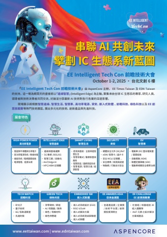 www.eettaiwan.com | www.edntaiwan.comEE Intelligent Tech Con %u524d%u77bb%u6280%u8853%u5927%u6703October 1-2, 2025 %u2022 %u53f0%u5317%u6587%u5275 6 %u6a13%u4e32%u806f AI %u5171%u5275%u672a%u4f86%u64d8%u5283 IC %u751f%u614b%u7cfb%u65b0%u85cd%u5716%u300cEE Intelligent Tech Con %u524d%u77bb%u6280%u8853%u5927%u6703%u300d%u7531 AspenCore %u4e3b%u8fa6%uff0c EE Times Taiwan %u53ca EDN Taiwan %u7684%u652f%u6301%uff0c%u9019%u4e00%u5834%u70ba%u671f%u5169%u5929%u7684%u76db%u6703%u5c07%u4ee5%u300c%u908a%u7de3%u667a%u6167%u300d(Intelligent Edge) %u70ba%u4e3b%u8ef8%uff0c%u805a%u96c6%u4f86%u81ea%u5168%u7403 IC %u751f%u614b%u7cfb%u7684%u5c08%u5bb6%u3001%u7814%u7a76%u4eba%u54e1%u3001%u9818%u5c0e%u8005%u8207%u6280%u8853%u6c7a%u7b56%u8005%u5171%u540c%u4ea4%u6d41%uff0c%u8a0e%u8ad6%u4e26%u5206%u4eab%u6700%u65b0 AI %u6280%u8853%u5c0d%u5404%u884c%u5404%u696d%u7684%u6df1%u9060%u5f71%u97ff%u3002%u73fe%u5834%u5c55%u793a%u5c07%u898f%u5283%u667a%u6167%u908a%u7de3%u3001%u667a%u6167%u751f%u6d3b%u3001%u667a%u6167%u8eca%u3001%u9ad8%u529f%u7387%u96fb%u6e90%u3001%u8cc7%u5b89%u3001%u5d4c%u5165%u5f0f%u8edf%u9ad4 %u3001%u524d%u77bb%u79d1%u6280%u3001%u7da0%u8272%u79d1%u6280%u4ee5%u53ca EE %u5275%u610f%u6311%u6230%u8cfd%u7b49%u71b1%u9580%u6280%u8853%u5c55%u5340%uff0c%u5c55%u51fa%u591a%u5143%u5316%u7684%u6280%u8853%u3001%u5275%u65b0%u7522%u54c1%u8207%u5148%u9032%u79d1%u6280%u3002HIGH-POWER POWER%u9ad8%u529f%u7387%u96fb%u6e90%u2022 %u5bec%u80fd%u9699%u534a%u5c0e%u9ad4%u8207%u529f%u7387%u96fb%u5b50%u2022 %u9ad8%u529f%u7387%u96fb%u6e90%u7cfb%u7d71 / %u7121%u7dda%u5145%u96fb%u2022 %u5132%u80fd%u7cfb%u7d71 / %u96fb%u7db2%u57fa%u790e%u8a2d%u65bd%u2022 %u96fb%u6e90%u7ba1%u7406%u3001%u80fd%u6e90%u6cd5%u898fINTELLIGNET EDGE%u667a%u6167%u908a%u7de3%u2022 %u908a%u7de3%u8207%u96f2%u7aef%u904b%u7b97%u2022 5G %u5c08%u7db2 /B5G/6G%u2022 %u667a%u6167%u5de5%u5ee0 / %u81ea%u52d5%u5316%u2022AIoT/Edge AI%u2022HPC/HBM %u8a18%u61b6%u9ad4SMART LIVING%u667a%u6167%u751f%u6d3b%u2022 %u611f%u6e2c%u8207%u9023%u7d50%uff1a%u5168%u9762%u4e32%u9023%u667a%u6167%u751f%u6d3b%u2022 %u667a%u6167%u7a7f%u6234%u5f0f / %u91ab%u7642%u88dd%u7f6e%u8207%u61c9%u7528%u2022 %u667a%u6167%u5bb6%u5ead / %u9023%u7db2%u5bb6%u5ead%u7cfb%u7d71%u2022 %u667a%u6167%u96fb%u6e90 / %u667a%u6167%u4ea4%u901a / %u80fd%u6e90%u7ba1%u7406SECURITY%u8cc7%u5b89%u2022 %u786c%u9ad4%u5b89%u5168%u5143%u4ef6 (SE)/RoT%u2022 eSIM/ %u667a%u6167%u5361 / %u6676%u7247%u5361%u2022 %u5b89%u5168 MCU/ %u8a18%u61b6%u9ad4 ...%u2022 %u5b89%u5168%u6a19%u6e96 / %u6aa2%u6e2c%u8207%u8a8d%u8b49%u2022 %u7269%u806f%u7db2 / %u884c%u52d5%u652f%u4ed8%u5b89%u5168EV%u667a%u6167%u8eca%u2022 %u96fb%u52d5%u8eca (EV) %u66a8%u5145%u96fb%u88dd%u7f6e/ %u57fa%u790e%u8a2d%u65bd%u2022 %u81ea%u52d5%u99d5%u99db /ADAS%u2022 %u8edf%u9ad4%u5b9a%u7fa9%u8eca%u8f1b (SDV)%u2022 %u96fb%u52d5%u8eca%u76f8%u95dc%u5b89%u5168%u6a19%u6e96%u6cd5%u898fTECH WATCH%u524d%u77bb%u79d1%u6280%u2022 %u77fd%u5149%u5b50%u2022 %u91cf%u5b50%u6280%u8853%u2022 6G/ %u4f4e%u8ecc%u9053%u885b%u661f%u2022 %u5148%u9032%u5c01%u88ddGREEN TECH%u7da0%u8272%u79d1%u6280%u2022 %u6de8%u96f6%u78b3%u6392 / %u7bc0%u80fd%u2022 AI/ %u4f3a%u670d%u5668 / %u6563%u71b1%u2022 %u7da0%u8272 / %u6709%u6a5f%u6750%u6599%u2022 %u7da0%u8272%u4f9b%u61c9%u93c8EMBEDDED SW%u5d4c%u5165%u5f0f%u8edf%u9ad4%u2022 %u5d4c%u5165%u5f0f%u7cfb%u7d71%u8a2d%u8a08 (ESD)%u2022 RISC-V/SoM%u2022 %u5d4c%u5165%u5f0f%u89e3%u6c7a%u65b9%u6848%u2022 %u5d4c%u5165%u5f0f%u7cfb%u7d71%u6e2c%u8a66%u8207%u9a57%u8b49%u2022 %u5d4c%u5165%u5f0f%u8edf%u9ad4EE AWARDS ASIA%u4e9e%u6d32%u91d1%u9078%u734e%u2022 %u91d1%u9078%u7522%u54c1%u596c / %u4f01%u696d%u734e/ %u6280%u8853%u5e73%u53f0%u596c / %u5275%u65b0%u596c%u5404%u734e%u9805%u5f97%u4e3bEE CHALLENGEEE %u5275%u610f%u6311%u6230%u8cfd%u2022 %u793e%u6703%u7d44 / %u6821%u5712%u7d44%u524d 20 %u7d44%u5165%u570d%u5718%u968a%u2022 AIoT %u5143%u7d20%u4e4b%u8a2d%u8a08%u89e3%u6c7a%u65b9%u6848%u6216%u7522%u54c1%u5c55%u6703%u7279%u8272