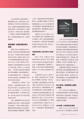 2025%u5e745-6%u6708 | www.eettaiwan.com5%u5728%u5168%u7403%u667a%u6167%u5316%u6d6a%u6f6e%u7684%u63a8%u52d5%u4e0b%uff0c%u908a%u7de3%u667a%u6167(Edge AI)%u9010%u6f38%u6210%u70ba%u5de5%u696d%u3001%u7269%u806f%u7db2(IoT)%u548c%u65e5%u5e38%u751f%u6d3b%u61c9%u7528%u7684%u6838%u5fc3%u6280%u8853%u3002%u96a8%u8457%u7d42%u7aef%u88dd%u7f6e%u6578%u91cf%u8207%u5373%u6642%u904b%u7b97%u9700%u6c42%u66b4%u589e%uff0c%u5fae%u63a7%u5236%u5668(MCU)%u7522%u696d%u6b63%u8fce%u4f86%u65b0%u4e00%u6ce2%u9769%u65b0%u6d6a%u6f6e%uff0c%u900f%u904e%u6574%u5408%u4eba%u5de5%u667a%u6167(AI)%u904b%u7b97%u8207%u8edf%u786c%u9ad4%u5354%u540c%u7684%u5c0e%u5165%uff0c%u91cd%u65b0%u69cb%u7bc9%u908a %u7de3%u751f%u614b%uff0c%u52a0%u901f%u667a%u6167%u8f49%u578b%u3002%u908a%u7de3%u904b%u7b97%uff1a%u5f9e%u96f2%u5230%u7aef%u7684%u7b97%u529b%u9769%u65b0%u96a8%u8457%u5de5%u696d4.0%u6d6a%u6f6e%u5e2d%u6372%u5168%u7403%uff0c%u5de5%u5ee0%u8a2d%u5099%u3001%u611f%u6e2c%u5668%u8207%u7d42%u7aef%u6578%u91cf%u5448%u73fe%u7206%u767c%u5f0f%u6210%u9577%uff0c%u5e02%u5834%u5c0d%u5373%u6642%u8cc7%u6599%u8655%u7406%u7684%u9700%u6c42%u8207%u65e5%u4ff1%u589e%u3002%u6839%u64daIDC%u9810%u6e2c%uff0c2025%u5e74%u5168%u7403%u7269%u806f%u7db2%u88dd%u7f6e%u5c07%u7a81%u7834550%u5104%u53f0%uff0c%u5176%u4e2d30%%u4ee5%u4e0a%u4f86%u81ea%u5de5%u696d%u9818%u57df%u3002%u7136%u800c%uff0c%u50b3%u7d71%u96c6%u4e2d%u5f0f%u96f2%u7aef%u904b%u7b97%u6a21%u5f0f%u5df2%u7121%u6cd5%u6eff%u8db3%u300c%u5373%u6642%u53cd%u994b%u300d%u7684%u9700%u6c42%u3002%u4ee5%u5de5%u696d%u751f%u7522%u70ba%u4f8b%uff0c%u4e00%u689d%u81ea%u52d5%u5316%u7522%u7dda%u6bcf%u79d2%u9700%u8655%u7406%u6578%u5343%u7b46%u99ac%u9054%u8f49%u901f%u3001%u6eab%u5ea6%u8207%u632f%u52d5%u8cc7%u6599%uff0c%u82e5%u5168%u6578%u56de%u50b3%u96f2%u7aef%u5206%u6790%uff0c%u4e0d%u50c5%u5ef6%u9072%u53ef%u80fd%u5c0e%u81f4%u751f%u7522%u4e8b%u6545%uff0c%u9ad8%u983b%u50b3%u8f38%u7684%u529f%u8017%u8207%u6210%u672c%u66f4%u6210%u70ba%u74f6%u9838%u3002%u300c %u908a %u7de3 %u667a %u6167 %u300d%u7684 %u5d1b %u8d77%uff0c%u6b63 %u662f%u56e0 %u61c9 %u9019%u4e00 %u767c%u5c55 %u8da8 %u52e2 %u7684 %u7d50 %u679c%u3002%u7279%u5225%u662f %u5728 %u8cc7 %u6599 %u96b1 %u79c1%u3001%u4f4e %u5ef6 %u9072 %u548c %u4f4e %u529f %u8017%u7684 %u6838%u5fc3 %u8a34 %u6c42 %u63a8 %u52d5%u4e0b%uff0cA I %u6280 %u8853 %u6b63 %u9010%u6f38 %u5411 %u908a %u7de3 %u7aef %u9077 %u79fb%uff0c%u5f9e %u800c %u5be6 %u73fe %u4f4e %u5ef6%u9072%u3001%u9ad8 %u6548 %u80fd %u4e14 %u66f4 %u5b89 %u5168 %u7684 %u8cc7 %u6599 %u8655 %u7406%u548c%u5373%u6642%u6c7a%u7b56%u3002%u56e0%u6b64%uff0c%u908a%u7de3%u904b%u7b97%u6b63%u9010%u6b65%u53d6%u4ee3%u96f2%u7aef%u904b%u7b97%u7684%u90e8%u4efd%u89d2%u8272%uff0c%u5c07%u8cc7%u6599%u8655%u7406%u79fb%u81f3%u7d42%u7aef%u9032%u884c%u3002%u4f8b%u5982%u5de5%u696d%u6a5f%u53f0%u53c3%u6578%u3001%u91ab%u7642%u5f71%u50cf%u7b49%u654f%u611f%u8cc7%u6599%u5728%u672c%u5730%u8655%u7406%uff0c%u907f%u514d%u96f2%u7aef%u50b3%u8f38%u7684%u6d29%u9732%u98a8%u96aa%u3002%u800c%u6a5f%u5668%u4eba%u5354%u4f5c%u3001%u96fb%u7db2%u6545%u969c%u6aa2%u6e2c%u7b49%u5834%u666f%u8981%u6c42%u6beb%u79d2(ms)%u7d1a%u97ff%u61c9%uff0c%u908a%u7de3AI%u53ef%u5c07%u6c7a%u7b56%u6642%u9593%u58d3%u7e2e%u81f31ms%u5167%u3002%u81f3%u65bc%u90e8%u7f72%u65bc%u91ce%u5916%u7684%u667a%u6167%u96fb%u8868%u3001%u8fb2%u696d%u611f%u6e2c%u5668%u9700%u4f9d%u9760%u96fb%u6c60%u904b%u4f5c%u6578%u5e74%uff0c%u908a%u7de3%u904b%u7b97%u4e5f%u80fd%u6e1b%u5c11%u8cc7%u6599%u50b3%u8f38%u80fd%u8017%u905490%%u3002%u6839%u64daABI Research%u63a8%u4f30%uff0c2027%u5e74%u5168%u7403%u908a%u7de3AI%u6676%u7247%u5e02%u5834%u898f%u6a21%u5c07%u7a81%u7834200%u5104%u7f8e%u5143%uff0c%u5176%u4e2d%u5de5%u696d%u8207%u7269%u806f%u7db2%u61c9%u7528%u4f54%u6bd4%u8d85%u904e50%%u3002%u9019%u610f%u5473%u8457%uff0c%u8ab0%u80fd%u638c%u63e1%u7d42%u7aef%u7b97%u529b%u8207%u80fd%u6548%u7684%u5e73%u8861%uff0c%u5c07%u5728%u9019%u4e00%u6ce2%u667a%u6167%u5316%u6d6a%u6f6e%u4e2d%u812b%u7a4e%u800c%u51fa%u3002%u4e2d%u570b%u667a%u9020%u5951%u6a5f%uff1a%u81ea%u4e3b%u53ef%u63a7MCU%u52a0%u901f%u5d1b%u8d77%u904e %u53bb %u5341 %u5e74 %u4f86%uff0c%u4e2d %u570b M C U %u5e02 %u5834%u9577%u671f%u7531%u6b50%u7f8e%u5927%u5ee0%u4e3b%u5c0e%uff0c%u7136%u800c%uff0c%u96a8%u8457%u4e2d%u7f8e%u79d1%u6280%u535a%u5f08%u8207%u4f9b%u61c9%u93c8%u5b89%u5168%u58d3%u529b%u52a0%u5287%uff0c%u4e2d%u570b%u7a4d%u6975%u63a8%u9032%u300c%u570b%u7522%u66ff%u4ee3%u300d%u7b56%u7565%uff0c%u4e26%u5df2%u5f9e%u653f%u7b56%u53e3%u865f%u8f49%u70ba%u7522%u696d%u525b%u6027%u9700%u6c42%uff0c%u672c%u571f%u4f01%u696d%u6b63%u52a0%u901f%u6436%u653b%u4e2d%u9ad8%u968e%u5e02%u5834%u3002%u5146%u6613%u5275%u65b0(GigaDevice)%u6293%u4f4f%u4e86%u9019%u4e00%u6a5f%u9047%uff0c%u900f %u904e%u5176%u5f37%u5316%u7684%u300c%u7aef-%u908a%u96f2%u300d%u5354%u540c%u6230%u7565%uff0c%u6210%u529f%u6436%u4f54%u4e00%u5e2d%u4e4b%u5730%uff0c%u6210%u70ba%u63a8%u52d5%u5de5%u696d%u548c%u7269%u806f%u7db2AI%u5316%u9769%u547d%u7684%u5148%u9a45%u3002%u7279%u5225%u662f%u5176GD32%u7cfb%u5217MCU%uff0c%u900f%u904eARM%u8207RISC-V%u96d9%u67b6%u69cb%u7b56%u7565%uff0c%u70ba%u4e0d%u540c%u5e02%u5834%u9700%u6c42%u63d0%u4f9b%u4e86%u9748%u6d3b%u7684%u9078%u64c7%u3002%u9019%u4e0d%u50c5%u4f7f%u5f97%u5b83%u80fd%u5920%u517c%u5bb9%u570b%u969b%u751f%u614b%uff0c%u9084%u5728%u6027%u80fd%u3001%u6210%u672c%u548c%u529f%u8017%u65b9%u9762%u53d6%u5f97%u4e86%u986f%u8457%u7684%u7a81%u7834%u3002%u4f8b%u5982%uff0cGD32H7%u7cfb%u5217%u4ee5600MHz%u4e3b%u983b%u8207%u96d9%u7cbe%u5ea6FPU%uff0c%u5be6%u73fe%u5de5 %u696d %u7d1a %u5373%u6642 %u63a7 %u5236%uff1b%u800c%u57fa%u65bcR IS C-V%u7684GD32VW553%uff0c%u5247%u6574%u5408Wi-Fi 6%u8207BLE 5.2%u7121%u7dda%u901a%u8a0a%uff0c%u7784%u6e96%u667a%u6167%u5bb6%u5ead%u5e02%u5834%u3002%u5c24%u5176%u5728%u9ad8%u6548%u80fd%u908a%u7de3AI%u63a8%u8ad6%u4e0a%uff0cGD32%u7cfb%u5217MCU%u53ef%u5c07AI%u63a8%u8ad6%u63a8%u5411%u7d42%u7aef%uff0c%u5be6%u73fe%u5f9e%u611f%u6e2c%u5668%u8cc7%u6599%u6536%u96c6%u5230%u5373%u6642%u6c7a%u7b56%u7684%u7121%u7e2b%u6574%u5408%uff0c%u8b93%u7269%u806f%u7db2%u548c%u5de5%u696d%u9818%u57df%u7684%u4f01%u696d%u80fd%u5920%u5be6%u73fe%u7aef%