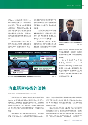 2025%u5e747-8%u6708 | www.eettaiwan.comINDUSTRY TRENDS 23%u662f O p e n G M S L%u5354 %u6703 %u4e3b %u5e2d %u7684 P a u l Fernando%u5728%u56de%u61c9%u300aEE Times%u300b%u7684%u63a1%u8a2a%u6642%u8868%u793a%uff1a%u300c%u591a%u5e74%u4f86%uff0cADI%u89c0%u5bdf%u5230%u9700%u6c42%u65e5%u6f38%u4e0a%u5347%u3001%u5c08%u5c6c%u6280%u8853%u5404%u81ea%u70ba%u653f%uff0c%u6295%u8cc7%u6210%u672c%u4e5f%u8d8a%u4f86%u8d8a%u9ad8%u3002%u82e5%u8981%u8b93%u9019%u500b%u7522%u696d%u6301%u7e8c%u6f14%u9032%uff0c%u5c31%u5fc5%u9808%u6709%u4e00%u500b%u958b%u653e%u3001%u7d93%u5f97%u8d77%u9053%u8def%u9a57%u8b49%u7684%u5f71%u50cf%u9023%u63a5%u89e3%u6c7a%u65b9%u6848%u3002%u300dFernando%u6307%u51fa%uff0c%u75ab%u60c5%u3001%u6676%u7247%u77ed%u7f3a%u8207%u5730%u7de3%u653f%u6cbb%u7b49%u8b8a%u6578%uff0c%u8b93%u8eca%u5ee0%u66f4%u6e34%u671b%u964d%u4f4e%u5c0d%u55ae%u4e00%u4f9b%u61c9%u5546%u7684%u4f9d%u8cf4%u3002%u7136%u800c%uff0c%u76ee%u524d%u8eca%u8f1b%u5167%u90e8%u5f80%u5f80%u6df7%u7528%u591a%u7a2e%u4e92%u4e0d%u76f8%u5bb9%u7684%u5f71%u50cf%u50b3%u8f38%u6280%u8853%uff0c%u4e0d%u4f46%u8b93%u958b%u767c%u8b8a%u5f97%u66f4%u8907%u96dc%uff0c%u4e5f%u62d6%u7d2f%u4e86%u5b89%u5168%u529f%u80fd%u7684%u5275%u65b0%u901f%u5ea6%u3002%u300c%u70ba%u4e86%u6539%u8b8a%u9019%u500b%u72c0%u6cc1%uff0cADI%u8207%u7522%u696d%u5925%u4f34%u651c%u624b%u63a8%u52d5%u4e00%u500b%u958b%u653e%u6a19%u6e96%uff0c%u7c21%u5316%u6210%u672c%u3001%u63d0%u5347%u4f9b%u61c9%u93c8%u97cc%u6027%u3001%u52a0%u901f%u7522%u54c1%u4e0a%u5e02%u6642%u7a0b%uff0c%u300dFernando%u88dc%u5145%u9053%u3002%u5728%u77ed%u671f%u5167%uff0cOpenGMSL%u5354%u6703%u7684%u95dc%u9375%u76ee%u6a19%u5305%u62ec%uff1a%u64f4%u5927%u6703%u54e1%u6578%u4ee5%u5f37%u5316%u6574%u9ad4%u751f%u614b%u7cfb%u3001%u5be9%u6838%u4e26%u901a%u904eGMSL2/3%u6280%u8853%u898f%u7bc4%uff0c%u4ee5%u53ca%u5236%u5b9a%u4e92%u901a%u6027%u6a19%u6e96%u4e26%u8a2d%u7acb%u76f8%u5bb9%u6027%u9a57%u8b49%u5be6%u9a57%u5ba4%u3002%u9577%u671f%u800c%u8a00%uff0c%u5354%u6703%u5c07%u62d3%u5c55%u65b0%u5e02%u5834%uff0c%u4e26%u63a8%u52d5%u4e0b%u4e00%u4ee3%u6280%u8853%u898f%u7bc4%u7684%u5efa%u7f6e%u3002%u5354 %u6703 %u5c07 %u63a1 %u7528%u300c %u5408 %u7406 %u4e14%u7121 %u6b67 %u8996 %u300d( r e a s o n a b l e , a n d nondiscriminatory)%u4e4b%u300cRAND%u300d%u6388%u6b0a%u689d%u6b3e%uff0c%u4e26%u8a2d%u6709%u7368%u7acb%u8463%u4e8b%u6703%u904b%u4f5c%uff0c%u9f13%u52f5%u5168%u7403%u696d%u8005%u53c3%u8207%uff0c%u4e26%u5f37%u5236%u57f7%u884c%u7522%u54c1%u7684%u5408%u898f%u6e2c%u8a66%uff0c%u4ee5%u78ba%u4fdd%u5404%u5bb6%u5ee0%u5546%u89e3%u6c7a%u65b9%u6848%u4e4b%u9593%u53ef%u7121%u7e2b%u4e92%u901a%u3002OpenGMSL%u5354%u6703%u4e3b%u5e2d%u66a8ADI%u5e02%u5834%u884c%u92b7%u7e3d%u76e3PaulFernando%u0009 %u0009 %u0009 %u0009%u0009%u0009%u0009%u0009%u0009%u0009%u0009%u0009%u0009(%u4f86%u6e90%uff1aADI)OpenGMSL%u5354%u6703%u65e8%u5728%u532f%u96c6%u7522%u696d%u9818%u5c0e%u696d%u8005%u3001%u9769%u65b0%u8eca%u8f09%u9023%u7d50%u672a%u4f86%u7684%u5021%u8b70%u884c%u52d5%u3002%u0009 %u0009 %u0009%u0009%u0009%u0009(%u4f86%u6e90%uff1aADI)%u4e9e%u99ac%u905c(Amazon) Alexa%u3001Google Assistant%u548c%u860b%u679c(Apple) Siri%u7b49%u6d88%u8cbb%u8005%u8a9e%u97f3%u5e73%u53f0%u7684%u8208%u8d77%u5f9e%u6839%u672c%u4e0a%u91cd%u5851%u4e86%u4eba%u5011%u5c0d%u8a9e%u97f3%u4e92%u52d5%u7684%u671f%u671b%u3002%u9019%u4e9b%u5728%u667a%u6167%u5bb6%u5ead%u548c%u500b%u4eba%u8a2d%u5099%u4e2d%u7121%u6240%u4e0d%u5728%u7684%u5e73%u53f0%u50ac%u751f%u4e86%u5c0d%u6c7d%u8eca%u4e2d%u5c0d%u8a71%u5f0f%u76f4%u89c0%u8a9e%u97f3%u7cfb%u7d71%u7684%u9700%u6c42%uff0c%u800c%u514d%u624b%u6301%u4e92%u52d5%u5df2%u6210%u70ba%u65b0%u8eca%u8cb7%u5bb6%u5c0d%u5b89%u5168%u6027%u548c%u4fbf%u5229%u6027%u7684%u671f%u671b%u3002%u8a9e%u97f3%u8fa8%u8b58%u6210%u70ba%u6c7d%u8eca%u7cfb%u7d71%u7684%u4e00%u90e8%u5206%u5df2%u6709%u4e8c%u5341%u591a%u5e74%u7684%u6b77%u53f2%uff0c%u5f9e%u798f%u7279(Ford) SYNC%u548c%u6885%u8cfd%u5fb7%u65af-%u8cd3%u58eb(MercedesBenz) Linguatronic%u7b49%u57fa%u65bc%u95dc%u9375%u5b57%u7684%u57fa%u672c%u7cfb%u7d71%u767c%u5c55%u5230%u6211%u5011%u4eca%u5929%u770b%u5230%u7684%u66f4%u5148%u9032%u7684%u8a9e%u97f3%u52a9%u624b%u3002%u65e9%u671f%u7684%u7cfb%u7d71%u529f%u80fd%u6709%u9650%uff0c%u547d%u4ee4%u7d50%u69cb%u50f5%u5316%uff0c%u7121%u6cd5%u8655%u7406%u81ea%u7136%u8a9e%u97f3%uff0c%u56e0%u6b64%u5e38%u5e38%u4ee4%u4f7f%u7528%u8005%u611f%u5230%u6cae%u55aa%u3002%u76ee%u524d%u7684%u7cfb%u7d71%u63a1%u7528%u5148%u9032%u7684%u81ea%u52d5%u8a9e%u97f3%u8fa8%u8b58(ASR)%u548c%u81ea%u7136%u8a9e%u8a00%u8655%u7406(NLP)%u6280%u8853%uff0c%u4e26%u7531%u9ea5%u514b%u98a8%u9663%u5217%u63d0%u4f9b%u652f%u63f4%uff0c%u53ef%u4ee5%u57f7%u884c%u8abf%u6574%u97f3%u91cf%u3001%u64a5%u6253%u96fb%u8a71%u6216%u66f4%u6539%u97f3%u6a02%u66f2%u76ee%u7b49%u57fa%u672c%u4efb%u52d9%u3002%u7136%u800c%uff0c%u5b83%u5011%u5728%u8655%u7406%u8907%u96dc%u6216%u4e0a%u4e0b%u6587%u76f8%u95dc%u7684%u547d%u4ee4%u6642%u537b%u986f%u5f97%u529b%u4e0d%u6c7d%u8eca%u8a9e%u97f3%u6280%u8853%u7684%u6f14%u9032Peter Cooney%uff0cSAR Insight & Consulting%u5275%u59cb%u4eba%u66a8%u7814%u7a76%u7e3d%u76e3