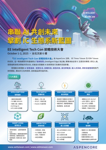 www.eettaiwan.com | www.edntaiwan.comEE Intelligent Tech Con %u524d%u77bb%u6280%u8853%u5927%u6703October 1-2, 2025 %u2022 %u53f0%u5317%u6587%u5275 6 %u6a13%u4e32%u806f AI %u5171%u5275%u672a%u4f86%u64d8%u5283 IC %u751f%u614b%u7cfb%u65b0%u85cd%u5716%u300cEE Intelligent Tech Con %u524d%u77bb%u6280%u8853%u5927%u6703%u300d%u7531 AspenCore %u4e3b%u8fa6%uff0c EE Times Taiwan %u53ca EDN Taiwan %u7684%u652f%u6301%uff0c%u9019%u4e00%u5834%u70ba%u671f%u5169%u5929%u7684%u76db%u6703%u5c07%u4ee5%u300c%u908a%u7de3%u667a%u6167%u300d(Intelligent Edge) %u70ba%u4e3b%u8ef8%uff0c%u805a%u96c6%u4f86%u81ea%u5168%u7403 IC %u751f%u614b%u7cfb%u7684%u5c08%u5bb6%u3001%u7814%u7a76%u4eba%u54e1%u3001%u9818%u5c0e%u8005%u8207%u6280%u8853%u6c7a%u7b56%u8005%u5171%u540c%u4ea4%u6d41%uff0c%u8a0e%u8ad6%u4e26%u5206%u4eab%u6700%u65b0 AI %u6280%u8853%u5c0d%u5404%u884c%u5404%u696d%u7684%u6df1%u9060%u5f71%u97ff%u3002%u73fe%u5834%u5c55%u793a%u5c07%u898f%u5283 AI %u667a%u6167%u908a%u7de3 %u3001%u667a%u6167%u751f%u6d3b%u3001%u524d%u77bb%u79d1%u6280%u3001%u7da0%u8272%u79d1%u6280%u3001%u9ad8%u529f%u7387%u96fb%u6e90%u3001%u5d4c%u5165%u5f0f%u7cfb%u7d71%uff0c%u8cc7%u5b89%u53ca%u667a%u6167%u8eca%u7b49%u71b1%u9580%u6280%u8853%u5c55%u5340%uff0c%u5c55%u51fa%u591a%u5143%u5316%u7684%u6280%u8853%u3001%u5275%u65b0%u7522%u54c1%u8207%u5148%u9032%u79d1%u6280%u3002HIGH-POWER POWER%u9ad8%u529f%u7387%u96fb%u6e90%u2022 %u5bec%u80fd%u9699%u534a%u5c0e%u9ad4%u8207%u529f%u7387%u96fb%u5b50%u2022 %u9ad8%u529f%u7387%u96fb%u6e90%u7cfb%u7d71 / %u7121%u7dda%u5145%u96fb%u2022 %u5132%u80fd%u7cfb%u7d71 / %u96fb%u7db2%u57fa%u790e%u8a2d%u65bd%u2022 %u96fb%u6e90%u7ba1%u7406%u3001%u80fd%u6e90%u6cd5%u898fINTELLIGNET EDGE%u667a%u6167%u908a%u7de3%u2022 %u908a%u7de3%u8207%u96f2%u7aef%u904b%u7b97%u2022 5G %u5c08%u7db2 /B5G/6G%u2022 %u667a%u6167%u5de5%u5ee0 / %u81ea%u52d5%u5316%u2022AIoT/Edge AI%u2022HPC/HBM %u8a18%u61b6%u9ad4SMART LIVING%u667a%u6167%u751f%u6d3b%u2022 %u611f%u6e2c%u8207%u9023%u7d50%uff1a%u5168%u9762%u4e32%u9023%u667a%u6167%u751f%u6d3b%u2022 %u667a%u6167%u7a7f%u6234%u5f0f / %u91ab%u7642%u88dd%u7f6e%u8207%u61c9%u7528%u2022 %u667a%u6167%u5bb6%u5ead / %u9023%u7db2%u5bb6%u5ead%u7cfb%u7d71%u2022 %u667a%u6167%u96fb%u6e90 / %u667a%u6167%u4ea4%u901a / %u80fd%u6e90%u7ba1%u7406SECURITY%u8cc7%u5b89%u2022 %u786c%u9ad4%u5b89%u5168%u5143%u4ef6 (SE)/RoT%u2022 eSIM/ %u667a%u6167%u5361 / %u6676%u7247%u5361%u2022 %u5b89%u5168 MCU/ %u8a18%u61b6%u9ad4 ...%u2022 %u5b89%u5168%u6a19%u6e96 / %u6aa2%u6e2c%u8207%u8a8d%u8b49%u2022 %u7269%u806f%u7db2 / %u884c%u52d5%u652f%u4ed8%u5b89%u5168TECH WATCH%u524d%u77bb%u79d1%u6280%u2022 %u6a5f%u5668%u4eba / %u7121%u4eba%u6a5f%u2022 %u77fd%u5149%u5b50 / %u9ad8%u901f%u4e92%u9023%u2022Chiplet/ %u5148%u9032%u5c01%u88ddGREEN TECH%u7da0%u8272%u79d1%u6280%u2022 %u6de8%u96f6%u78b3%u6392 / %u7bc0%u80fd%u2022 AI/ %u4f3a%u670d%u5668 / %u6563%u71b1%u2022 %u7da0%u8272 / %u6709%u6a5f%u6750%u6599%u2022 %u7da0%u8272%u4f9b%u61c9%u93c8EMBEDDED SW%u5d4c%u5165%u5f0f%u8edf%u9ad4%u2022 %u5d4c%u5165%u5f0f%u7cfb%u7d71%u8a2d%u8a08 (ESD)%u2022 RISC-V/SoM%u2022 %u5d4c%u5165%u5f0f%u89e3%u6c7a%u65b9%u6848%u2022 %u5d4c%u5165%u5f0f%u7cfb%u7d71%u6e2c%u8a66%u8207%u9a57%u8b49%u2022 %u5d4c%u5165%u5f0f%u8edf%u9ad4%u516b%u5927%u5c55%u5340 :EV%u667a%u6167%u8eca%u2022 %u96fb%u52d5%u8eca (EV) %u66a8%u5145%u96fb%u88dd%u7f6e/ %u57fa%u790e%u8a2d%u65bd%u2022 %u81ea%u52d5%u99d5%u99db /ADAS%u2022 %u8edf%u9ad4%u5b9a%u7fa9%u8eca%u8f1b (SDV)%u2022 %u96fb%u52d5%u8eca%u76f8%u95dc%u5b89%u5168%u6a19%u6e96%u6cd5%u898f