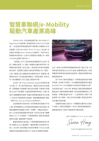 2025%u5e747-8%u6708 | www.eettaiwan.comEDITOR%u2019S NOTES 12025%u5e74%u4e0a%u534a%u5e74%uff0c%u79d1%u6280%u7522%u696d%u8a71%u984c%u4e0d%u65b7%uff0c360%u00b0 MOBILITY Mega Shows%u624d%u525b%u843d%u5e55%uff0c%u7dca%u63a5%u8457%u5c31%u662fCOMPUTEX 2025%u767b%u5834%uff0c%u4e00%u6ce2%u6ce2%u5275%u65b0%u71b1%u6f6e%u63a5%u9023%u9ede%u71c3%u6c7d%u8eca%u667a%u6167%u5316%u8207%u96fb%u52d5%u5316%u7684%u672a%u4f86%u85cd%u5716%u3002%u5c24%u5176%u4eca%u5e74COMPUTEX%u4ee5%u300cAI Next%u300d%u70ba%u4e3b%u8ef8%uff0c%u4e26%u6db5%u84cb%u672a%u4f86%u79fb%u52d5(Smart Mobility)%u4e3b%u984c%u5c55%u793a%uff0c%u591a%u5bb6%u79d1%u6280%u5927%u5ee0%u7a4d%u6975%u4f48%u5c40%u8eca%u7528AI%u3001%u751f%u614b%u5e73%u53f0%u8207%u96fb%u6c23%u5316%u95dc%u9375%u5143%u4ef6%uff0c%u5c55%u73fee-Mobility%u7522%u696d%u5347%u7d1a%u7684%u6c7a%u5fc3%u3002%u300c%u667a%u6167%u8eca%u300d%u4e26%u4e0d%u53ea%u662f%u81ea%u99d5%u8eca%u6216%u96fb%u52d5%u8eca%u7684%u4ee3%u540d%u8a5e%uff0c%u800c%u662f%u4e00%u5834%u878d%u5408%u611f%u6e2c%u3001AI%u3001%u901a%u8a0a%u3001%u8edf%u9ad4%u8207%u6c38%u7e8c%u7684%u8de8%u754c%u9769%u547d%u3002%u5f9e%u8eca%u8f1b%u7684%u80fd%u8017%u7ba1%u7406%u3001%u5b89%u5168%u6c7a%u7b56%u3001%u4eba%u6a5f%u4e92%u52d5%u5230%u8207%u57ce%u5e02%u57fa%u790e%u8a2d%u65bd%u7684%u5354%u4f5c%uff0c%u667a%u6167%u8eca%u6b63%u91cd%u5851%u4ea4%u901a%u7cfb%u7d71%u8207%u79fb%u52d5%u65b9%u5f0f%u3002%u90a3%u9ebc%uff0c%u6253%u9020%u4e00%u8f1b%u771f%u6b63%u7d50%u5408%u96fb%u52d5%u8eca%u8207%u81ea%u99d5%u8eca%u7279%u6027%u7684%u300c%u667a%u6167%u8eca%u300d%u9700%u8981%u54ea%u4e9b%u6280%u8853%uff1f%u5982%u4f55%u900f%u904e%u8edf%u786c%u6574%u5408%uff0c%u5728%u7bc0%u80fd%u6e1b%u78b3%u3001%u9ad8%u5b89%u5168%u6027%u3001%u4e58%u5750%u9ad4%u9a57%u8207%u4eba%u6027%u5316%u4e92%u52d5%u4e4b%u9593%u53d6%u5f97%u5e73%u8861%uff1f%u5728%u65e5%u524d%u4e00%u5834%u300cSmart eMobility Taipei%u672a%u4f86%u8eca%u7814%u8a0e%u66a8%u4ea4%u6d41%u6703%u300d%u4e2d%uff0c%u591a%u4f4d%u696d%u754c%u5c08%u5bb6%u6307%u51fa%uff0c%u5118%u7ba1%u5168%u7403%u8eca%u5e02%u53d7%u5230%u901a%u81a8%u3001%u4f9b%u61c9%u93c8%u58d3%u529b%u8207%u6574%u9ad4%u4e0d%u78ba%u5b9a%u6027%u7684%u5f71%u97ff%uff0c%u4f46%u667a%u6167%u5316%u8207%u96fb%u6c23%u5316%u5df2%u6210%u4e0d%u53ef%u9006%u8da8%u52e2%u3002%u672c%u671f%u5c01%u9762%u6545%u4e8b%u5373%u805a%u7126%u9019%u4e00%u4e3b%u984c%uff0c%u900f%u904e%u672c%u520a%u7de8%u8f2f%u5718%u968a%u7684%u5831%u5c0e%uff0c%u638c%u63e1AI%u8207%u8edf%u9ad4%u5b9a%u7fa9%u8eca(SDV)%u7684%u5c0e%u5165%uff0c%u5982%u4f55%u70ba%u6c7d%u8eca%u7522%u696d%u6339%u6ce8%u65b0%u52d5%u80fd%u3001%u91cd%u5851%u6574%u9ad4%u50f9%u503c%u93c8%uff0c%u958b%u555f%u300c%u8eca%u5373%u5e73%u53f0%u300d(Car-as-a-Platform)%u7684%u65b0%u6642%u4ee3%u3002%u5728%u9019%u5834%u7522%u696d%u5347%u7d1a%u7684%u80cc%u5f8c%uff0c%u6280%u8853%u8207%u61c9%u7528%u7684%u6311%u6230%u4ea6%u4e0d%u5bb9%u5c0f%u89b7%u3002%u696d%u754c%u8da8%u52e2%u55ae%u5143%u4ee5%u591a%u89d2%u5ea6%u63a2%u7d22%u667a%u6167%u8eca%u7684%u6280%u8853%u6f14%u9032%u3002%u7f8e%u570b%u7248%u7de8%u8f2f%u5e36%u56de%u9ad8%u901a%u5c55%u793a%u7684%u7b2c%u4e00%u624b%u89c0%u5bdf%uff1a%u4e00%u8f1b%u7d50%u5408%u8a9e%u97f3AI%u3001%u500b%u4eba%u5316%u529f%u80fd%u8207%u81ea%u52d5%u99d5%u99db%u7684%u539f%u578b%u8eca%uff0c%u5982%u540c%u79d1%u5e7b%u5f71%u96c6%u300a%u9739%u9742%u904a%u4fe0%u300b(K.I.T.T.)%u4e2d%u7684%u5925%u8a08%uff0c%u4e0d%u50c5%u7406%u89e3%u8a9e%u610f%uff0c%u9084%u80fd%u4f9d%u60c5%u7dd2%u8abf%u6574%u8eca%u5167%u6c1b%u570d%uff0c%u8b93%u667a%u6167%u8eca%u4e0d%u518d%u662f%u5922%u3002%u96a8%u8457%u667a%u6167%u8eca%u5feb%u901f%u6f14%u9032%uff0c%u6c7d%u8eca%u8edf%u9ad4%u958b%u767c%u96e3%u5ea6%u8207%u65e5%u4ff1%u589e%u3002%u6839%u64daPerforce%u8abf%u67e5%u986f%u793a%uff0c%u5118%u7ba1%u8edf%u9ad4%u5df2%u6210%u70ba%u8eca%u7528%u5e73%u53f0%u6838%u5fc3%uff0c%u4f46%u6cd5%u898f%u3001%u6e2c%u8a66%u8207%u6574%u5408%u6d41%u7a0b%u4f9d%u7136%u7e41%u96dc%uff0cPerforce%u5408%u898f%u7e3d%u76e3%u5256%u6790%u7576%u524d%u75db%u9ede%u8207%u6539%u5584%u65b9%u5411%uff0c%u4e26%u70baSDV%u767c%u5c55%u63d0%u4f9b%u5efa%u8b70%u3002%u6b64%u5916%uff0c%u9577%u671f%u4ee5%u4f86%u8eca%u7528%u5f71%u50cf%u50b3%u8f38%u898f%u683c%u5c01%u9589%uff0c%u6574%u5408%u4e0d%u6613%uff0cADI%u7b49%u696d%u8005%u8fd1%u671f%u767c%u8d77OpenGMSL%u5354%u6703%uff0c%u63a8%u52d5%u958b%u653e%u5354%u5b9a%uff0c%u4fc3%u9032%u8eca%u8f09%u611f%u6e2c%u8207%u5f71%u50cf%u7cfb%u7d71%u5275%u65b0%u52a0%u901f%u843d%u5730%uff0c%u671f%u671b%u70ba%u667a%u6167%u8eca%u6280%u8853%u61c9%u7528%u958b%u555f%u65b0%u5c40%u3002%u9664%u4e86%u672a%u4f86%u6c7d%u8eca%u7684%u667a%u6167%u9032%u5316%uff0c%u672c%u671f%u96dc%u8a8c%u9084%u6536%u9304%u591a%u9805%u7cbe%u5f69%u5831%u5c0e%u3002%u5728%u5275%u65b0%u5929%u5730%u55ae%u5143%uff0c%u672c%u520a%u7de8%u8f2f%u900f%u904e%u5716%u96c6%u5e36%u60a8%u91cd%u6eab%u5728COMPUTEX 2025%u73fe%u5834%u5c55%u793a%u7684%u4eae%u9ede%u6280%u8853%u8207%u89e3%u6c7a%u65b9%u6848%uff0c%u5305%u62ec%u8eca%u7528AI%u6676%u7247%u3001HMI%u4ecb%u9762%u3001%u6563%u71b1%u6676%u7247%u8207%u80fd%u6e90%u7ba1%u7406%u6a21%u7d44%u7b49%u6700%u65b0%u6280%u8853%uff0c%u6355%u6349%u73fe%u5834%u7cbe%u5f69%u77ac%u9593%u3002%u800c%u5728%u601d%u7dad%u8207%u89c0%u9ede%u55ae%u5143%uff0c%u8996%u89d2%u66f4%u9032%u4e00%u6b65%u8f49%u5411%u9059%u9060%u7684%u672a%u4f86%u2014%u2014%u706b%u661f%u63a2%u7d22%u662f%u4eba%u985e%u7684%u4e0b%u500b%u8ecc%u9053%u55ce%uff1f%u9019%u4e0d%u50c5%u662f%u4e00%u500b%u592a%u7a7a%u79d1%u6280%u7684%u8b70%u984c%uff0c%u66f4%u662f%u80fd%u6e90%u8207%u5730%u7403%u6c38%u7e8c%u7684%u591a%u91cd%u547d%u984c%u3002%u667a%u6167%u8eca%u7684%u767c%u5c55%u6b63%u8655%u65bcAI%u3001%u534a%u5c0e%u9ad4%u8207%u6c38%u7e8c%u79d1%u6280%u4ea4%u6703%u7684%u5341%u5b57%u8def%u53e3%u3002%u672c%u671f%u5167%u5bb9%u9080%u8acb%u60a8%u4e00%u540c%u6df1%u5165%u63a2%u7d22%u9019%u5834%u667a%u6167%u9769%u547d%uff0c%u638c%u63e1%u7522%u696d%u65b0%u5c40%uff0c%u898b%u8b49%u6c7d%u8eca%u7522%u696d%u5982%u4f55%u9081%u5411%u9ad8%u5cf0%u3002Susan.Hong@aspencore.com%u300a%u96fb%u5b50%u5de5%u7a0b%u5c08%u8f2f%u300b(EE Times Taiwan)%u4e3b%u7de8%u667a%u6167%u8eca%u80