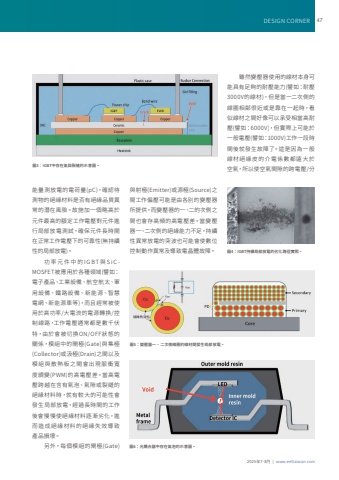 2025%u5e747-8%u6708 | www.eettaiwan.comDESIGN CORNER 47%u57163%uff1aIGBT%u4e2d%u5b58%u5728%u6c23%u8207%u88c2%u7e2b%u7684%u793a%u610f%u5716%u3002%u57165%uff1a%u8b8a%u58d3%u5668%u4e00%u3001%u4e8c%u6b21%u5074%u7dda%u5708%u7684%u7dda%u6750%u9593%u767c%u751f%u5c40%u90e8%u653e%u96fb%u3002%u57164%uff1aIGBT%u6301%u7e8c%u5c40%u90e8%u653e%u96fb%u7684%u52a3%u5316%u8def%u5f91%u5be6%u7167%u3002%u80fd%u91cf%u6e2c%u653e%u96fb%u7684%u96fb%u8377%u91cf(pC)%uff0c%u78ba%u8a8d%u5f85%u6e2c%u7269%u7684%u7d55%u7de3%u6750%u6599%u662f%u5426%u6709%u7d55%u7de3%u54c1%u8cea%u7570%u5e38%u7684%u6f5b%u5728%u98a8%u96aa%u3002%u6545%u65bd%u52a0%u4e00%u500b%u7565%u9ad8%u65bc%u5143%u4ef6%u6700%u9ad8%u7684%u984d%u5b9a%u5de5%u4f5c%u96fb%u58d3%u5c0d%u5143%u4ef6%u9032%u884c%u5c40%u90e8%u653e%u96fb%u6e2c%u8a66%uff0c%u78ba%u4fdd%u5143%u4ef6%u9577%u6642%u9593%u5728%u6b63%u5e38%u5de5%u4f5c%u96fb%u58d3%u4e0b%u7684%u53ef%u9760%u6027(%u7121%u6301%u7e8c%u6027%u7684%u5c40%u90e8%u653e%u96fb)%u3002%u529f%u7387%u5143%u4ef6%u4e2d%u7684IGBT%u8207SiCMOSFET%u88ab%u61c9%u7528%u65bc%u5404%u7a2e%u9818%u57df(%u8b6c%u5982%uff1a%u96fb%u5b50%u7522%u54c1%u3001%u5de5%u696d%u8a2d%u5099%u3001%u822a%u7a7a%u822a%u592a%u3001%u8ecd%u7528%u8a2d%u5099%u3001%u9435 %u8def%u8a2d%u5099%u3001%u65b0%u80fd%u6e90%u3001%u667a%u6167%u96fb%u7db2%u3001%u65b0%u80fd%u6e90%u8eca%u7b49)%uff0c%u800c%u4e14%u7d93%u5e38%u88ab%u4f7f%u7528%u65bc%u9ad8%u529f%u7387/%u5927%u96fb%u6d41%u7684%u96fb%u6e90%u8f49%u63db/%u63a7%u5236%u7dda%u8def%uff0c%u5de5%u4f5c%u96fb%u58d3%u901a%u5e38%u90fd%u662f%u6578%u5343%u4f0f%u7279%uff0c%u7531%u65bc%u6703%u88ab%u5207%u63dbON/OFF%u72c0%u614b%u7684%u95dc%u4fc2%uff0c%u6a21%u7d44%u4e2d%u7684%u9598%u6975(Gate)%u8207%u96c6%u6975(Collector)%u6216%u6c72%u6975(Drain)%u4e4b%u9593%u4ee5%u53ca%u6a21%u7d44%u8207%u6563%u71b1%u677f%u4e4b%u9593%u6703%u51fa%u73fe%u8108%u885d%u5bec%u5ea6%u8abf%u8b8a(PWM)%u7684%u9ad8%u96fb%u58d3%u5dee%u3002%u7576%u9ad8%u96fb%u58d3%u8de8%u8d8a%u5728%u542b%u6709%u6c23%u6ce1%u3001%u6c23%u9699%u6216%u88c2%u7e2b%u7684%u7d55%u7de3%u6750%u6599%u6642%uff0c%u5c31%u6709%u8f03%u5927%u7684%u53ef%u80fd%u6027%u6703%u767c%u751f%u5c40%u90e8%u653e%u96fb%uff0c%u7d93%u904e%u9577%u6642%u9593%u7684%u5de5%u4f5c%u5f8c%u6703%u6162%u6162%u4f7f%u7d55%u7de3%u6750%u6599%u9010%u6f38%u52a3%u5316%uff0c%u9032%u800c%u9020%u6210%u7d55%u7de3%u6750%u6599%u7684%u7d55%u7de3%u5931%u6548%u5c0e%u81f4%u7522%u54c1%u640d%u58de%u3002%u53e6%u5916%uff0c%u6bcf%u500b%u6a21%u7d44%u7684%u9598%u6975(Gate)%u8207%u5c04%u6975(Emitter)%u6216%u6e90%u6975(Source)%u4e4b%u9593%u5de5%u4f5c%u504f%u58d3%u53ef%u80fd%u662f%u7531%u5404%u5225%u7684%u8b8a%u58d3%u5668%u6240%u63d0%u4f9b%uff0c%u800c%u8b8a%u58d3%u5668%u7684%u4e00%u3001%u4e8c%u7684%u6b21%u5074%u4e4b%u9593%u4e5f%u6703%u5b58%u9ad8%u983b%u7684%u9ad8%u96fb%u58d3%u5dee%u3002%u7576%u8b8a%u58d3%u5668%u4e00%u3001%u4e8c%u6b21%u5074%u7684%u7d55%u7de3%u80fd%u529b%u4e0d%u8db3%uff0c%u6301%u7e8c%u6027%u7570%u5e38%u653e%u96fb%u7684%u7a81%u6ce2%u4e5f%u53ef%u80fd%u6703%u4f7f%u6578%u4f4d%u63a7%u5236%u52d5%u4f5c%u7570%u5e38%u53ca%u5c0e%u81f4%u96fb%u6676%u9ad4%u6545%u969c%u3002%u96d6%u7136%u8b8a%u58d3%u5668%u4f7f%u7528%u7684%u7dda%u6750%u672c%u8eab%u53ef%u80fd%u5177%u6709%u8db3%u5920%u7684%u8010%u58d3%u80fd%u529b(%u8b6c%u5982%uff1a%u8010%u58d33000V%u7684%u7dda%u6750)%uff0c%u4f46%u662f%u7576%u4e00%u4e8c%u6b21%u5074%u7684%u7dda%u5708%u76f8%u9130%u5f88%u8fd1%u6216%u662f%u9760%u5728%u4e00%u8d77%u6642%uff0c%u770b%u4f3c%u7dda%u6750%u4e4b%u9593%u597d%u50cf%u53ef%u4ee5%u627f%u53d7%u76f8%u7576%u9ad8%u8010%u58d3(%u8b6c%u5982%uff1a6000V)%uff0c%u4f46%u5be6%u969b%u4e0a%u53ef%u80fd%u65bc%u4e00%u822c%u96fb%u58d3(%u8b6c%u5982%uff1a1000V)%u5de5%u4f5c%u4e00%u6bb5%u6642%u9593%u5f8c%u5c31%u767c%u751f%u6545%u969c%u4e86%u3002%u9019%u662f%u56e0%u70ba%u4e00%u822c%u7dda%u6750%u7d55%u7de3%u76ae%u7684%u4ecb%u96fb%u4fc2%u6578%u90fd%u9060%u5927%u65bc%u7a7a%u6c23%uff0c%u6240%u4ee5%u4f7f%u7a7a%u6c23%u9593%u9699%u7684%u8de8%u96fb%u58d3/%u5206%u57166%uff1a%u5149%u8026%u5408%u5668%u4e2d%u5b58%u5728%u6c23%u6ce1%u7684%u793a%u610f%u5716%u3002