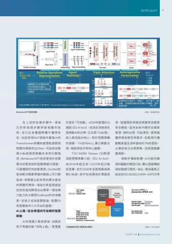 2025%u5e747-8%u6708 | www.eettaiwan.com52025%u5e747-8%u6708 | www.eettaiwan.comSPOTLIGHT 5%u5728 %u4e0a %u8ff0 %u7684 %u81ea %u99d5 %u6b65 %u9a5f %u4e2d%uff0c%u9d3b %u6d77%u5df2%u91dd%u5c0d%u6bcf%u500b%u6b65%u9a5f%u7814%u767c%u76f8%u95dc%u7684%u6280%u8853%uff0c%u4e26%u5df2 %u5728 %u5404 %u7a2e %u570b %u969b %u8cfd %u4e2d %u7372 %u5f97 %u80af%u5b9a%u3002%u5305%u62ec%u4f7f%u7528NLP%u9818%u57df%u4e2d%u6700%u5f37%u5927%u7684Transformer%u67b6%u69cb%u4f86%u8655%u7406%u8ecc%u8de1%u9810%u6e2c%u554f%u984c%u6240%u958b%u767c%u7684QCNet%uff0c%u53ef%u5354%u52a9%u81ea%u99d5%u8ecaAI%u7cfb%u7d71%u9810%u6e2c%u8eca%u8f1b%u672a%u4f86%u7684%u884c%u99db%u8def%u5f91%uff1bBehaviorGPT%u6280%u8853%u662f%u7528%u65bc%u81ea%u99d5%u7b97%u6cd5%u5c01%u9589%u6e2c%u8a66%u7684%u667a%u6167%u6a21%u64ec%u4ee3%u7406%u5668%uff0c%u53ef%u5efa%u69cb%u5f88%u597d%u7684%u81ea%u99d5%u74b0%u5883%uff1bOccNet%u5247%u662f%u70ba%u89e3%u6c7a%u9700%u8981%u6e96%u78ba%u5224%u65b7%u8def%u4e0a%u53ef%u884c%u99db%u5340%u57df%uff0c%u8207%u9700%u8981%u4ee5%u6709%u6548%u7387%u7684%u7b97%u6cd5%u9054%u6210%u7684%u554f%u984c%u6240%u958b%u767c%u3002%u9d3b%u6d77%u4e5f%u5e0c%u671b%u900f%u904e%u9019%u4e9b%u6280%u8853%u9054%u6210%u958b%u767c%u51fa%u53f0%u7063%u7b2c%u4e00%u500b%u6709%u63a8%u529b%u80fd%u529b%u7684%u5927%u6a21%u578bFoxBrain%u7684%u672a%u4f86%u9858%u666f%uff0c%u4e26%u4f7f%u4e4b%u6210%u70ba%u667a%u6167%u88fd%u9020%u3001%u667a%u6167EV%u548c%u667a%u6167%u57ce%u5e02%u4e09%u5927%u5e73%u53f0%u7684%u57fa%u790e%u3002AI%u4e0a%u8def%uff1a%u5f9e%u5408%u898f%u9081%u5411%u53ef%u4fe1%u8cf4%u7684%u667a%u6167%u79fb%u52d5AI%u5feb%u901f%u5c0e%u5165%u8eca%u7528%u9818%u57df%uff0c%u81ea%u99d5%u6280%u8853%u4e0d%u518d%u50c5%u8a0e%u8ad6%u300c%u4f55%u6642%u4e0a%u8def%u300d%uff0c%u66f4%u8457%u91cd%u65bc%u662f%u5426%u300c%u53ef%u4fe1%u8cf4%u300d%u30022024%u5e74%u6b50%u76df(EU)%u901a%u904e%u300aEU AI Act%u300b%uff0c%u6210%u70ba%u5168%u7403%u9996%u90e8%u5168%u9762%u898f%u7bc4AI%u7684%u6cd5%u6848%uff0c%u6b63%u5f0f%u5c07%u300cAI%u5408%u898f%u300d%u7d0d%u5165%u8eca%u7528%u8a2d%u8a08%u6838%u5fc3%u3002%u5c0d%u65bc%u667a%u6167%u8eca%u8f1b%u7684%u767c%u5c55%uff0c%u300cAI%u5982%u4f55Act%u300d%u5ee3%u6cdb%u727d%u52d5%u6cd5%u898f%u3001%u98a8%u96aa%u8207%u4fe1%u4efb%u7b49%u6838%u5fc3%u8b70%u984c%u3002T%u00dcV NORD Taiwan (%u5317%u5fb7)%u8cc7%u6df1%u7d93%u7406%u9673%u80b2%u7fa3%u4ecb%u7d39%uff0c%u300aEU AI Act%u300b%u81ea2024 %u5e74%u8d77%u751f%u6548%uff0c202 5%u5e74%u8d77%u5206%u968e%u6bb5%u843d%u5be6%uff0c%u4e26%u65bc2026%u5e74%u5168%u9762%u898f%u7bc4%u9ad8%u98a8%u96aaAI%u7cfb%u7d71%uff0c%u5176%u4e2d%u5305%u62ec%u61c9%u7528%u65bc%u8eca%u9053%u5075BehaviorGPT%u6280%u8853%u67b6%u69cb%u3002%u0009%u0009 %u0009 %u0009 %u0009 %u0009 %u0009 %u0009 %u0009 %u0009 %u0009%u0009%u0009%u0009%u0009%u0009%u0009%u0009%u0009(%u4f86%u6e90%uff1a%u9d3b%u6d77%u7814%u7a76%u9662)%u6e2c%u3001%u78b0%u649e%u9810%u9632%u8207%u8def%u5f91%u898f%u5283%u7b49%u81ea%u99d5%u8eca%u5b89%u5168%u6a21%u7d44%u3002%u9019%u4e9b%u7cfb%u7d71%u5747%u9700%u7b26%u5408%u98a8%u96aa%u7ba1%u7406%u3001%u8cc7%u6599%u6cbb%u7406%u3001%u53ef%u8ffd%u6eaf%u6027%u3001%u900f%u660e%u63ed%u9732%u8207%u8cc7%u5b89%u97cc%u6027%u7b49%u8981%u6c42%uff0c%u82e5%u9055%u898f%u4ee3%u50f9%u52d5%u8f12%u9ad8%u9054%u5168%u7403%u5e74%u71df%u6536%u7d047%%u7684%u7f70%u6b3e%uff0c%u4f01%u696d%u82e5%u7f3a%u4e4f%u5408%u898f%u7b56%u7565%uff0c%u6050%u5c07%u9762%u81e8%u56b4%u91cd%u98a8%u96aa%u3002%u76f8%u8f03%u65bc%u50b3%u7d71%u8edf%u9ad4%uff0cAI%u529f%u80fd%u4ef0%u8cf4%u8cc7%u6599%u9a45%u52d5%u7684%u6a21%u578b%u884c%u70ba%uff0c%u96e3%u4ee5%u900f%u904e%u50b3%u7d71%u6e2c%u8a66%u9a57%u8b49%u53ef%u9760%u6027%u3002%u70ba%u6b64%uff0c%u8eca%u7528%u7522%u696d%u6b63%u7d50%u5408%u5982ISO 26262/21434%u3001ASPICE%u7b49%u6c7d%u8eca%u7522%u696d%u7684%u73fe%u884c%u6a19%u6e96%u8207AI%u6a19%u6e96%u3002%u0009%u0009 %u0009 %u0009 %u0009 %u0009%u0009%u0009%u0009%u0009%u0009%u0009%u0009%u0009%u0009%u0009%u0009%u0009%u0009(%u4f86%u6e90%uff1aT%u00dcV NORD)