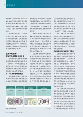 www.eettaiwan.com | 2025%u5e747-8%u67086| 2025%u5e747-8%u6708SPOTLIGHT%u65e2%u6709%u6a19%u6e96%uff0c%u4ee5%u53caISO/PAS 8800%u3001ISO/IEC 42001%u7b49%u65b0%u8208AI%u898f%u7bc4%uff0c%u5efa%u7acb%u6db5%u84cb%u8a2d%u8a08%u3001%u8a13%u7df4%u3001%u90e8%u7f72%u5230%u6e2c%u8a66%u7684%u5168%u751f%u547d%u9031%u671f%u7ba1%u7406%u67b6%u69cb%uff0c%u8b93AI%u5f9e%u300c%u9ed1%u7bb1%u300d%u8f49%u70ba%u300c%u767d%u76d2%u300d%uff0c%u63d0%u5347%u53ef%u89e3%u91cb%u6027%u8207%u5408%u898f%u900f%u660e%u5ea6%u3002%u9673%u80b2%u7fa3%u5f37%u8abf%uff0c%u300aEU AI Act%u300b%u7684%u5408%u898f%u4e0d%u53ea%u662f%u6cd5%u5f8b%u8cac%u4efb%uff0c%u66f4%u662fAI%u6cbb%u7406%u8207%u98a8%u96aa%u7ba1%u7406%u7684%u8d77%u9ede%u3002%u4f01%u696d%u9700%u5728%u958b%u767c%u521d%u671f%u5c0e%u5165%u300c%u98a8%u96aa%u70ba%u672c%u300d%u8a2d%u8a08%u601d%u7dad%uff0c%u660e%u78ba%u5b9a%u7fa9%u9069%u7528%u5834%u666f(ODD)%u3001%u8a13%u7df4%u8cc7%u6599%u54c1%u8cea%u8207%u6a21%u578b%u884c%u70ba%u908f%u8f2f%uff0c%u6253%u9020%u53ef%u8ffd%u6eaf%u3001%u98a8%u96aa%u53ef%u63a7%u7684%u8ca0%u8cac%u4efbAI%u7cfb%u7d71%u3002%u91cd%u69cb%u8eca%u8f09%u67b6%u69cb%uff1a%u96fb%u6c23%u5e73%u53f0%u8207%u95dc%u9375%u5143%u4ef6%u5347%u7d1a%u667a%u6167%u8eca%u529f%u80fd%u65e5%u76ca%u8907%u96dc%uff0c%u50b3%u7d71%u8eca%u8f1b%u96fb%u6c23%u67b6%u69cb(E/E)%u9010%u6f38%u7121%u6cd5%u8ca0%u8377%uff0c%u65b0%u4e00%u4ee3%u5340%u57df(Zonal)%u67b6%u69cb%u56e0%u61c9%u800c%u751f%u3002%u5f9e%u96fb%u58d3%u8f49%u578b%u5230%u5143%u4ef6%u6574%u5408%uff0c%u8eca%u8f09%u5e73%u53f0%u6b63%u8d70%u5411%u66f4%u9ad8%u6548%u3001%u66f4%u6a21%u7d44%u5316%u7684%u7cfb%u7d71%u8a2d%u8a08%uff0c%u540c%u6642%u9ad8%u5ea6%u5f37%u8abf%u5b89%u5168%u8207%u53ef%u9760%u6027%u3002%u4e0b%u4e00%u4ee3%u5340%u57df%u67b6%u69cb%u7684%u95dc%u9375%u6280%u8853%u50b3%u7d71%u8eca%u8f1b%u7684%u67b6%u69cb%u4e2d%uff0c%u6bcf%u7a2e%u529f%u80fd%u7686%u81ea%u6210%u4e00%u683c%u3002%u4f46%u96a8%u8457%u8eca%u8f1b%u5167%u90e8%u5143%u4ef6%u7684%u8907%u96dc%u6027%u9010%u6f38%u63d0%u9ad8%u3001%u8eca%u8f1b%u914d%u96fb%u548c%u4f9b%u96fb%u67b6%u69cb%u5df2%u5f9e12V%u8de8%u81f348V%uff0c%u4ee5%u53ca%u9700%u8981%u900f%u904e%u8eca%u8f09%u7db2%u8def(IVN)%u4fc3%u9032%u61c9%u7528%u7a0b%u5f0f%u4e4b%u9593%u7684%u901a%u8a0a%u2026%u7b49%u7a2e%u7a2e%u539f%u56e0%uff0c%u8eca%u8f1b%u7684E/E%u67b6%u69cb%u9700%u8981%u9032%u4e00%u6b65%u7684%u8f49%u8b8a%uff0c%u624d%u80fd%u56e0%u61c9%u529f%u80fd%u8d8a%u4f86%u8d8a%u591a%u4e14%u66f4%u667a%u6167%u5316%u7684%u8eca%u8f1b%u6240%u9700%u3002%u82f1%u98db%u51cc(Infineon)%u5927%u4e2d%u83ef%u5340%u6c7d%u8eca%u96fb%u5b50%u4e8b%u696d%u90e8%u9996%u5e2d%u5de5%u7a0b%u5e2b%u9673%u5bb6%u6a02%u8868%u793a%uff0cE/E%u67b6%u69cb%u7531%u8eca%u8f09%u7db2%u8def%u548c%u914d%u96fb%u7cfb%u7d71%u7d44%u6210%uff0c%u4f46%u7531%u65bc%u4e00%u4e9b%u80cc%u5f8c%u7684%u56e0%u7d20%uff0c%u5982%u6e1b%u8f15E/E%u7cfb%u7d71%u7684%u91cd%u91cf%u3001%u6613%u65bc%u7d44%u88dd%u548c%u7dad%u8b77%u3001%u964d%u4f4e%u7cfb%u7d71%u6210%u672c%u3001%u63d0%u9ad8%u7528%u6236%u7684%u5b89%u5168%u6027%u548c%u8212%u9069%u5ea6%u2026%u7b49%uff0c%u5c0e%u81f4%u5340(Zone)%u67b6%u69cb%u76ee%u524d%u5c1a%u7121%u660e%u78ba%u7684%u5b9a%u7fa9%u3002%u82e5%u5f9e%u6d88%u8cbb%u8005%u7684%u89d2%u5ea6%u4f86%u770b%u8eca%u8f09%u7db2%u8def%uff0c%u5247%u5206%u5340%u67b6%u69cb%u548c%u5206%u6563%u5f0f%u914d%u96fb%u80fd%u5920%u4ee5%u66f4%u4f4e%u7684%u6210%u672c%u5be6%u73fe%u66f4%u597d%u7684%u7cfb%u7d71%u3002%u4e0d%u904e%uff0c%u9673%u5bb6%u6a02%u6307%u51fa%uff0c%u76ee%u524dE/E %u67b6%u69cb%u8f49%u578b%u4ecd%u8655%u65bc%u5e7e%u4ee3%u5171%u5b58%u7684%u72c0%u6cc1%uff0c%u9019%u4e5f%u610f%u5473%u8457%u5c0d%u5340%u63a7%u5236%u55ae%u5143%u7684%u9700%u6c42%u5404%u4e0d%u76f8%u540c%u3002%u4f46%u53ef%u4ee5%u770b%u5230%u7684%u662f%uff0c%u8eca%u8f09%u7db2%u8def%u6b63%u9081%u5411%u96c6%u4e2d%u5316%uff0c%u529f%u80fd%u548c%u667a%u6167%u5f9e%u7aef%u9ede%u50b3%u8f38%u5230%u5340%u63a7%u5236%u55ae%u5143(ZCU)%u4e2d%uff0c%u4e14%u6839%u64da%u767c%u96fb%u60c5%u6cc1%uff0cZCU%u53ef%u4ee5%u805a%u5408%u672c%u5730%u529f%u80fd%uff0c%u4f8b%u5982%u914d%u96fb%u548c%u9a45%u52d5%u3001%u9598%u9053%u548c48V/12V%u8f49%u63db%u3002%u56e0%u6b64%uff0c%u53d7%u5230%u964d%u4f4e%u8edf%u9ad4%u8207%u7dda%u675f%u8907%u96dc%u6027%u3001%u9a45%u52d5E/E%u67b6%u69cb%u8f49%u8b8a%u7684%u56e0%u7d20%u3002%u0009 %u0009 %u0009 %u0009 %u0009 %u0009%u0009%u0009%u0009%u0009%u0009%u0009%u0009%u0009%u0009%u0009%u0009%u0009%u0009%u0009%u0009%u0009%u0009%u0009%u0009%u0009(%u4f86%u6e90%uff1a%u82f1%u98db%u51cc)%u53ef%u7528%u6027%u548c%u6545%u969c%u904b%u4f5c%u53ca%u66f4%u9ad8%u7684%u529f%u7387%u5bc6%u5ea6%u4e09%u5927%u8eca%u8f1b%u767c%u5c55%u8da8%u52e2%u7684%u63a8%u52d5%uff0c%u6240%u884d%u751f%u7684E/E%u67b6%u69cb%u7684%u8f49%u578b%u4e2d%uff0c%u6df7%u5408%u57df/%u5340%u67b6%u69cb%u9810%u671f%u5c07%u5728%u672a%u4f86%u5e7e%u5e74%u53d6%u4ee3%u73fe%u6709%u7684%u5206%u6563%u5f0f%u6216%u7d14%u57fa%u65bc%u57df%u7684%u67b6%u69cb%uff0c%u4e26%u9032%u4e00%u6b65%u6210%u70ba%u4e0b%u4e00%u4ee3%u8eca%u8f1b%u4e3b%u6d41%u7684%u67b6%u69cb%u3002%u7136%u800c%uff0c%u6311%u6230%u4e5f%u96a8%u4e4b%u800c%u4f86%u3002%u9673%u5bb6%u6a02%u8a8d%u70ba%uff0c%u91dd%u5c0dE/E%u67b6%u69cb%u8f49%u8b8a%u6240%u884d%u751f%u7684%u6311%u6230%uff0c%u82f1%u98db%u51cc%u7686%u6709%u76f8%u5c0d%u61c9%u4e14%u901a%u904eISO 26262/21434%u898f%u7bc4%u7684%u89e3%u6c7a%u65b9%u6848%uff0c%u5982%u91dd%u5c0d48V%u61c9%u7528%u7684%u96fb%u6e90%u76f8%u95dc%u7522%u54c1%u3001%u5340%u63a7%u5236%u6240%u9700%u7684%u5fae%u63a7%u5236%u5668(MCU)%u2026%u7b49%uff0c%u53ef%u5354%u52a9%u696d%u8005%u514b%u670d%u96e3%u984c%u3002%u900f%u904e%u95dc%u9375%u5143%u4ef6%u63d0%u9ad8%u667a%u6167EV%u53ef%u9760%u6027%u53ef%u9760%u6027%u8207%u5b89%u5168%u6027%u5c0d%u65bc%u50b3%u7d71%u8eca%u8f1b%u6216%u662f%u667a%u6167%u8eca%u3001%u672a%u4f86%u7684%u81ea%u99d5%u8eca%u4f86%u8aaa%uff0c%u90fd%u662f%u76f8%u7576%u91cd%u8981%u7684%u95dc%u9375%uff0c%u4e0d%u53ef%u56e0%u8981%u70ba%u8eca%u8f1b%u958b%u767c%u7433%u746f%u6eff%u76ee%u7684%u65b0%u529f%u80fd%uff0c%u5c31%u72a7%u7272%u53ef%u9760%u6027%uff0c%u4e14%u4e00%u4e01%u9ede%u7684%u59a5%u5354%u90fd%u662f%u4e0d%u88ab%u