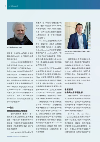 www.eettaiwan.com | 2025%u5e749-10%u67088 SPOTLIGHT%u95dc%u91cd%u8981%uff0c%u5c24%u5176%u662f%u7576AI%u8d85%u8d8a%u5148%u9032%u99d5%u99db%u8f14%u52a9%u7cfb%u7d71(ADAS)%uff0c%u9032%u5165%u5340%u57df%u5316%u67b6%u69cb%u548c%u4f4e%u968e%u529f%u80fd%u6642%u3002%u300dCEA-Leti%u5948%u7c73%u8a18%u61b6%u9ad4%u8207%u904b%u7b97%u5143%u4ef6%u5be6%u9a57%u5ba4%u8ca0%u8cac%u4ebaFran%u00e7ois Andrieu%u5247%u4ecb%u7d39%u66f4%u5ee3%u6cdb%u7684%u8a18%u61b6%u9ad4%u751f%u614b%u7cfb%u7d71%uff0c%u5305%u62ecOxRAM%u3001MRAM%u548cFeRAM%u7b49%u8a18%u61b6%u9ad4%u3002%u4ed6%u6307%u51fa%uff0c%u6bcf%u4e00%u7a2e%u8a18%u61b6%u9ad4%u90fd%u6709%u5176%u7368%u7279%u7684%u512a%u52e2%uff0c%u5982OxRAM%u975e%u5e38%u9069%u5408%u5c0d%u6210%u672c%u654f%u611f%u7684AI%u7279%u5b9a%u61c9%u7528%u3001MR AM%u5728 %u9ad8 %u5beb %u5165 %u74b0 %u5883 %u4e2d %u5177%u5099 %u7a69 %u5065 %u6027%uff0c%u800cFeRAM%u5247%u63d0%u4f9b%u51fa%u8272%u7684%u80fd%u6548%u548c%u8010%u7528%u6027%u3002Andrieu%u6307%u51fa%uff0c%u300c%u6c92%u6709%u4e00%u9ad4%u9069%u7528%u7684%u89e3%u6c7a%u65b9%u6848%u2014%u2014%u4e0d%u540c%u7684%u61c9%u7528%u9700%u8981%u4e0d%u540c%u7684%u6280%u8853%u3002%u300d%u56e0%u6b64%uff0cCE A-Leti%u6b63%u8207ST%u3001Weebit Nano%u7b49%u7d44%u7e54%u5408%u4f5c%uff0c%u540c%u6b65%u63a2%u7d22%u591a%u7a2e%u65b9%u6cd5%u30023D%u6574%u5408%uff1a%u53e6%u95dc%u8e4a%u5f91%u7a81%u7834%u8a18%u61b6%u9ad4%u7246%u7576HPC%u7684%u9700%u6c42%u4e0d%u65b7%u63a8%u5347%uff0c%u55ae%u4e00%u6280%u8853%u96e3%u4ee5%u6eff%u8db3%u80fd%u6548%u8207%u5ef6%u9072%u7684%u96d9%u91cd%u8981%u6c42%u30023D%u6574%u5408%u70ba%u534a%u5c0e%u9ad4%u8a2d%u8a08%u63d0%u4f9b%u65b0%u7684%u7dad%u5ea6%uff0c%u4e0d%u50c5%u88ab%u8996%u70ba%u7a81%u7834%u8a18%u61b6%u9ad4%u7246%u7684%u95dc%u9375%uff0c%u4e5f%u70ba%u7570%u8cea%u6574%u5408%u92ea%u8def%uff0c%u8b93HPC%u67b6%u69cb%u66f4%u5177%u5f48%u6027%u3002Andrieu%u6307%u51fa%uff0c3D%u6574%u5408%u5c0dAI%u81f3%u95dc%u91cd%u8981%uff0c%u9664%u4e86%u589e%u52a0%u8a18%u61b6%u9ad4%u5bb9%u91cf%uff0c%u66f4%u63d0%u4f9b%u4e86%u6574%u5408%u4e0d%u540c%u6280%u8853%u6216CMOS%u7bc0%u9ede%u7684%u6a5f%u6703%u3002%u4ed6%u8aaa%uff1a%u300c%u85c9%u7531%u9ad8%u5bc6%u5ea6%u7684%u5782%u76f4%u4e92%u9023%uff0c%u6211%u5011%u53ef%u4ee5%u5c07%u8a18%u61b6%u9ad4%u8207%u904b%u7b97%u55ae%u5143%u66f4%u7dca%u5bc6%u7d50%u5408%uff0c%u9032%u4e00%u6b65%u63d0%u5347%u983b%u5bec%u4e26%u964d%u4f4e%u5ef6%u9072%u3002%u300dCEA-Leti%u6b63%u7a4d%u6975%u63a8%u52d5%u55ae%u7247%u5f0f3D%u6574%u5408%uff0c%u76f4%u63a5%u5728%u540c%u4e00%u7247%u6676%u5713%u4e0a%u5efa%u69cb%u908f%u8f2f%u8207%u8a18%u61b6%u9ad4%u3002%u76f8%u5f62%u4e4b%u4e0b%uff0c%u6df7%u5408%u9375%u5408(hybrid bonding)%u5247%u7528%u65bc%u9023%u63a5%u7368%u7acb%u88fd%u9020%u7684%u6676%u7247%u5c64%u3002Andrieu%u88dc%u5145%uff1a%u300c%u55ae%u7247%u5f0f3D%u5143%u4ef6%u63d0%u4f9b%u6700%u9ad8%u5bc6%u5ea6%uff0c%u4f46%u6df7%u5408%u9375%u5408(%u5806%u758a%u6676%u7247%u6216%u6676%u5713)%u4e5f%u662f%u6709%u529b%u7684%u624b%u6bb5%uff0c%u5169%u8005%u90fd%u80fd%u85c9%u7531%u6e1b%u5c11%u8cc7%u6599%u50b3%u8f38%u5ef6%u9072%u63d0%u5347%u6548%u80fd%u3002%u300dDesoli%u8868%u793a%uff0cST%u5df2%u591a%u5e74%u5728%u91cf%u7522%u4e2d%u4f7f%u7528%u6df7%u5408%u9375%u5408%u6280%u8853%uff0c%u5c24%u5176%u7d50%u5408%u5149%u5b78%u8207%u6578%u4f4d%u5143%u4ef6%u7684%u5f71%u50cf%u611f%u6e2c%u5668%u3002%u5c0d%u65bcEdge AI%u88dd%u7f6e%uff0c%u7279%u5225%u662f%u6574%u5408%u611f%u6e2c%u529f%u80fd%u7684%u7522%u54c1%uff0c%u6df7%u5408%u9375%u5408%u63d0%u4f9b%u4e86%u53ef%u91cf%u7522%u7684%u5be6 %u7528%u65b9%u6848%u3002%u96d6 %u7136%u55ae%u7247%u5f0f 3D%u5806 %u758a%u5728%u9598%u6975%u63d0%u4f9b%u66f4%u9ad8%u7c92%u5ea6%u548c%u9748%u6d3b%u6027%uff0c%u4f46%u4e5f%u5e36%u4f86%u65b0%u7684%u6311%u6230%uff0c%u5c24%u5176%u5728%u8a2d%u8a08%u81ea%u52d5%u5316%u5de5%u5177%u65b9%u9762%u3002Desoli%u6307%u51fa%uff0c%u300c%u5782%u76f4%u5c64%u4e0a%u7684%u908f%u8f2f%u5283%u5206%uff0c%u6703%u628a%u539f%u672c%u76842D%u8a2d%u8a08%u554f%u984c%uff0c%u8f49%u8b8a%u6210%u66f4%u8907%u96dc%u76843D%u554f%u984c%u3002%u300d%u71b1%u7ba1%u7406%u66f4%u662f3D%u5806%u758a%u7cfb%u7d71%u7684%u6838%u5fc3%u6311%u6230%u3002Desoli%u8aaa%uff1a%u300c%u8a18%u61b6%u9ad4%u8207%u904b%u7b97%u5c64%u5806%u758a%u8d8a%u7dca%u5bc6%uff0c%u4e2d%u5c64%u71b1%u91cf%u7a4d%u805a%u8d8a%u56b4%u91cd%uff0c%u53ef%u80fd%u5f71%u97ff%u53ef%u9760%u6027%u8207%u6548%u80fd%u3002%u300d%u70ba%u6b64%uff0cST%u8207EDA%u4f9b%u61c9%u5546%u5408%u4f5c%uff0c%u5c07%u71b1%u6a21%u64ec%u6574%u5408%u5230%u8a2d%u8a08%u6d41%u7a0b%u4e2d%uff0c%u4e26%u5229%u7528AI%u52a0%u901f%u591a%u7269%u7406%u5834%u6a21%u64ec%u5de5%u5177%uff0c%u8b93%u8a2d%u8a08%u8005%u80fd%u5728%u77ed%u6642%u9593%u5167%u63a2%u7d22%u66f4%u591a%u65b9%u6848%u3002CEA-Leti%u4e5f%u900f%u904e%u5171%u540c%u8a2d%u8a08%u96fb%u8def%u8207%u4f48%u5c40%uff0c%u4e26%u958b%u767c%u65b0%u6750%u6599%u8207%u7d50%u69cb%uff0c%u4ee5%u964d%u4f4e%u71b1%u9ede%u3001%u63d0%u5347%u6563%u71b1%u6548%u7387%u3002%u5118 %u7ba1%u9762%u81e8%u71b1%u7ba1%u7406%u8207%u8a2d%u8a08%u5de5%u5177%u7b49%u8af8%u591a%u6311%u6230%uff0c%u5169%u4f4d%u5c08%u5bb6%u4ecd%u5c0d3D%u6574%u5408%u7684%u9577%u671f%u524d%u666f%u8868%u793a%u6a02%u89c0%u3002%u4ed6%u5011%u5f37%u8abf%uff0c%u5c07%u7814%u7a76%u6210%u679c%u63a8%u5411%u5be6%u969b%u7522%u54c1%u901a%u5e38%u9700%u89815~10%u5e74%uff0c%u5305%u62ec%u91cd%u8907%u8a2d%u8a08%u3001%u88fd%u7a0b%u6539%u826f%u548c%u53ef%u9760%u6027%u6e2c%u8a66%u3002%u800c%u9ad8%u6548%u80fd%u904b%u7b97%u3001%u5c24%u5176%u662fAI%u52a0%u901f%u7684%u591a%u7269%u7406%u5834%u6a21%u64ec%u5de5%u5177%uff0c%u5c07%u5927%u5e45%u7e2e%u77ed%u9019%u4e00%u9031%u671f%uff0c%u52a0%u901f3D%u6574%u5408%u5728AI%u8207%u908a%u7de3%u904b%u7b97%u7684%u843d%u5730%u3002%u6c38%u7e8c%u5275%u65b0%uff1a%u63a8%u52d5%u9ad8%u6548%u534a%u5c0e%u9ad4%u751f%u614b%u96a8%u8457AI%u8207HPC%u5de5%u4f5c%u8ca0%u8f09%u8fc5%u901f%u589e%u52a0%uff0c%u80fd%u6e90%u6548%u7387%u8207%u8cc7%u6e90%u6700%u4f73%u5316%u6210%u70ba%u65b0%u7684%u7af6%u722d%u7126%u9ede%u3002%u751f%u6210%u5f0fAI%u6a21%u578b%u7684%u5fae%u578b%u5316%u8207%u908a%u7de3%u90e8%u7f72%uff0c%u4f7f%u5f97%u7b97%u529b%u6d88%u8017%u53ef