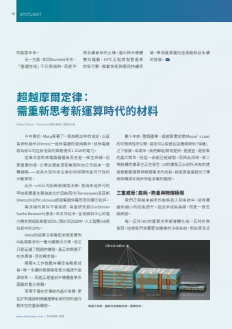 www.eettaiwan.com | 2025%u5e749-10%u670810 SPOTLIGHT%u8d85%u8d8a%u6469%u723e%u5b9a%u5f8b%uff1a%u9700%u91cd%u65b0%u601d%u8003%u65b0%u904b%u7b97%u6642%u4ee3%u7684%u6750%u6599%u4eca%u5e74%u590f%u521d%uff0cMeta%u7c3d%u7f72%u4e86%u4e00%u9805%u70ba%u671f20%u5e74%u7684%u5354%u5b9a%uff0c%u4ee5%u5ef6%u9577%u4f0a%u5229%u8afe%u5dde(Illinois)%u4e00%u5ea7%u6838%u96fb%u5ee0%u7684%u4f7f%u7528%u58fd%u547d%uff0c%u8a72%u6838%u96fb%u5ee0%u5c07%u70ba%u8a72%u516c%u53f8%u5728%u8a72%u5730%u5340%u7684%u696d%u52d9%u63d0%u4f9b1.1GW%u7684%u96fb%u529b%u3002%u9019%u7b46%u4ea4%u6613%u5c0d%u6838%u96fb%u5ee0%u71df%u904b%u5546%u800c%u8a00%u662f%u4e00%u689d%u751f%u547d%u7dda%u3002%u4f46%u66f4%u91cd%u8981%u7684%u662f%uff0c%u5b83%u6a19%u8a8c%u8457%u80fd%u6e90%u5bc6%u96c6%u578b%u79d1%u6280%u516c%u53f8%u8fce%u4f86%u4e00%u500b%u8f49%u6369%u9ede%u2014%u2014%u6210%u70ba%u5927%u578b%u79d1%u6280%u4f01%u696d%u5982%u4f55%u4fdd%u969c%u6838%u80fd%u53ef%u884c%u6027%u7684%u793a%u7bc4%u6848%u4f8b%u3002%u6b64%u5916%uff0cxAI%u516c%u53f8%u56e0%u7121%u8996%u74b0%u5883%u6cd5%u898f%uff0c%u4f7f%u7528%u672a%u7d93%u8a31%u53ef%u7684%u7532%u70f7%u6c23%u9ad4%u7522%u751f%u5668%u70ba%u5176%u4f4d%u65bc%u7530%u7d0d%u897f%u5dde(Tennessee)%u5b5f%u83f2%u65af(Memphis)%u7684Colossus%u8d85%u7d1a%u96fb%u8166%u4f9b%u96fb%u800c%u53d7%u5230%u5ee3%u6cdb%u6279%u8a55%u3002%u9700%u6c42%u7aef%u7684%u8cc7%u6599%u4e0d%u6703%u8aaa%u8b0a%uff1a%u9ad8%u76db%u7814%u7a76%u90e8(Goldman Sachs Research)%u9810%u6e2c%uff0c%u5230%u672c%u4e16%u7d00%u672b%uff0c%u5168%u7403%u8cc7%u6599%u4e2d%u5fc3%u7684%u96fb%u529b%u9700%u6c42%u5c07%u6210%u9577%u9ad8%u9054165%%uff1b%u9810%u8a08%u52302028%u5e74%uff0c%u4eba%u5de5%u667a%u6167(AI)%u5c07%u4f54%u5176%u4e2d%u768419%%u3002Meta%u7684%u9019%u7b46%u4ea4%u6613%u770b%u8d77%u4f86%u50cf%u662f%u61c9%u5c0dAI%u80fd%u6e90%u9700%u6c42%u7684%u4e00%u7a2e%u5927%u81bd%u89e3%u6c7a%u65b9%u6848%uff0c%u4f46%u5b83%u53ea%u662f%u5ef6%u7de9%u4e86%u554f%u984c%u7684%u7206%u767c%u3002%u771f%u6b63%u7684%u554f%u984c%u4e0d%u5728%u4f9b%u61c9%u7aef%uff0c%u800c%u5728%u9700%u6c42%u7aef%u3002%u96a8%u8457AI%u5de5%u4f5c%u8ca0%u8f09%u6301%u7e8c%u5448%u6307%u6578%u7d1a%u6210%u9577%uff0c%u552f%u4e00%u6c38%u7e8c%u7684%u767c%u5c55%u8def%u5f91%u662f%u5927%u5e45%u63d0%u5347%u80fd%u6e90%u6548%u7387%u2014%u2014%u800c%u9019%u6b63%u662f%u7576%u524d%u534a%u5c0e%u9ad4%u7522%u696d%u6240%u9762%u81e8%u7684%u91cd%u5927%u6311%u6230%u3002%u7b54%u6848%u4e0d%u50c5%u5728%u65bc%u50b3%u7d71%u7684%u6676%u7247%u67b6%u69cb%uff0c%u66f4%u5728%u65bc%u5c0d%u9023%u63a5%u548c%u9694%u96e2%u904b%u7b97%u7cfb%u7d71%u7684%u6750%u6599%u9032%u884c%u6839%u672c%u6027%u7684%u91cd%u65b0%u69cb%u60f3%u3002%u6578%u5341%u5e74%u4f86%uff0c%u6574%u500b%u7522%u696d%u4e00%u76f4%u88ab%u6469%u723e%u5b9a%u5f8b(Moore%u2019s Law)%u7684%u53ef%u9810%u6e2c%u6027%u6240%u5f15%u5c0e%uff0c%u751a%u81f3%u53ef%u4ee5%u8aaa%u662f%u5728%u9019%u7a2e%u898f%u5f8b%u7684%u300c%u4fdd%u8b77%u300d%u4e4b%u4e0b%u767c%u5c55%u3002%u6bcf%u5169%u5e74%uff0c%u6211%u5011%u90fd%u80fd%u671f%u5f85%u66f4%u5feb%u3001%u66f4%u4fbf%u5b9c%u3001%u66f4%u5bc6%u96c6%u7684%u6676%u7247%u554f%u4e16%u3002%u4f46%u9019%u4e00%u627f%u8afe%u5df2%u7d93%u7834%u88c2%uff0c%u800c%u8207%u6b64%u540c%u6642%uff0c%u7b2c%u4e8c%u5834%u7d50%u69cb%u6027%u8b8a%u9769%u4e5f%u6b63%u5728%u767c%u751f%uff1aAI%u7684%u7206%u767c%u6b63%u4ee5%u524d%u6240%u672a%u6709%u7684%u901f%u5ea6%u63a8%u52d5%u8457%u904b%u7b97%u8207%u983b%u5bec%u9700%u6c42%u7684%u6210%u9577%uff0c%u5176%u901f%u5ea6%u9060%u9060%u8d85%u51fa%u4e86%u50b3%u7d71%u67b6%u69cb%u539f%u672c%u8a2d%u8a08%u6240%u80fd%u627f%u8f09%u7684%u6975%u9650%u3002%u4e09%u91cd%u5a01%u8105%uff1a%u80fd%u8017%u3001%u71b1%u91cf%u8207%u7269%u7406%u6975%u9650%u6211%u5011%u6b63%u5c07%u8d8a%u4f86%u8d8a%u591a%u7684%u80fd%u8017%u6295%u5165%u5230%u7cfb%u7d71%u4e2d%uff0c%u537b%u6536%u7a6b%u8d8a%u4f86%u8d8a%u5c0f%u7684%u6027%u80fd%u63d0%u5347%u3002%u9019%u4e26%u975e%u6210%u9577%u66f2%u7dda%uff0c%u800c%u662f%u4e00%u500b%u5371%u96aa%u8a0a%u865f%u3002%u6bcf%u4e00%u74e6%u7279(W)%u7684%u904b%u7b97%u529f%u7387%u90fd%u6703%u8f49%u5316%u70ba%u4e00%u74e6%u7279%u7684%u71b1%u8ca0%u8377%uff0c%u8feb%u4f7f%u6211%u5011%u90e8%u7f72%u66f4%u52a0%u8907%u96dc%u7684%u51b7%u537b%u7cfb%u7d71%uff0c%u4f8b%u5982%u6d78%u6c92%u5f0fStefan Pastine%uff0cThintronics%u806f%u5408%u5275%u59cb%u4eba%u66a8%u57f7%u884c%u9577%u8de8%u6676%u7247%u5c01%u88dd%u3001%u57fa%u677f%u548c%u4e3b%u6a5f%u677f%u7684%u7d71%u4e00%u7d55%u7de3%u6750%u6599%u3002%u7684%u667a%u6167%u672a%u4f86%u3002%u53e6%u4e00%u65b9%u9762%uff0c%u5982%u540cBartlett%u6240%u8a00%uff0c%u300c%u57fa%u790e%u6280%u8853%u300d%u4e0d%u4ee3%u8868%u904e%u6642%uff0c%u800c%u662f%u5b55%u80b2%u6c38%u7e8c%u5275%u65b0%u7684%u571f%u58e4%u3002%u7576AI%u8207%u534a%u5c0e%u9ad4%u96d9%u5411 %u9a45 %u52d5%uff0cH P C %u6b63 %u9ede %u71c3 %u667a%u6167 %u7522 %u696d%u7684%u65b0%u5f15%u64ce%uff0c%u63a8%u52d5%u6280%u8853%u8207%u61c9%u7528%u6301%u7e8c%u7a81%u7834%uff0c%u5e36%u9818%u7522%u696d%u9081%u5411%u5168%u9762%u5275%u65b0%u4e14%u6c38%u7e8c%u7684%u767c%u5c55%u3002