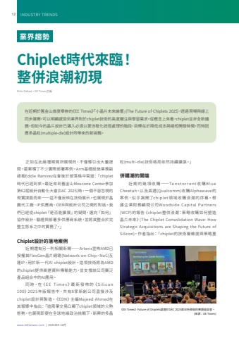 www.eettaiwan.com | 2025%u5e749-10%u670812 INDUSTRY TRENDSChiplet%u6642%u4ee3%u4f86%u81e8%uff01%u6574%u4f75%u6d6a%u6f6e%u521d%u73feNitin Dahad%uff0cEE Times%u4e3b%u7de8%u7c92(multi-die)%u6280%u8853%u683c%u5c40%u4f9d%u7136%u6301%u7e8c%u64f4%u5f35%u3002%u300d%u4f75%u8cfc%u6f6e%u7684%u958b%u7aef%u8fd1 %u671f %u7684 %u5e7e %u9805 %u6536 %u8cfc %u2014%u2014Te n s t o r r e n t %u6536 %u8cfc B l u e Cheetah%uff0c%u4ee5%u53ca%u9ad8%u901a(Qualcomm)%u6536%u8cfcAlphawave%u7684%u6848%u4f8b%uff0c%u4f3c%u4e4e %u63ed%u958b%u4e86chiplet %u9818 %u57df%u6536 %u8cfc %u6d6a %u6f6e%u7684%u5e8f %u5e55%u3002%u6839%u64da%u4f01%u696d%u8ca1%u52d9%u9867%u554f%u516c%u53f8Woodside Capital Par tners (WCP)%u7684%u5831%u544a%u300achiplet%u6574%u4f75%u6d6a%u6f6e%uff1a%u7b56%u7565%u6536%u8cfc%u5982%u4f55%u5851%u9020%u6676%u7247%u672a%u4f86%u300b(The Chiplet Consolidation Wave: How Strategic Acquisitions are Shaping the Future of Silicon)%uff0c%u4f5c%u8005%u6307%u51fa%uff1a%u300cchiplet%u7684%u6280%u8853%u8907%u96dc%u5ea6%u8207%u7b56%u7565%u91cd%u6b63%u5982%u5728%u6b64%u8ad6%u58c7%u671f%u9593%u6240%u5c55%u73fe%u7684%uff0c%u4e0d%u50c5%u5c0e%u5f15%u51fa%u5927%u91cf%u63d0%u554f%uff0c%u9084%u7d2f%u7a4d%u4e86%u4e0d%u5c11%u5be6%u969b%u90e8%u7f72%u6848%u4f8b%u3002Arm%u57fa%u790e%u8a2d%u65bd%u696d%u52d9%u526f%u7e3d%u88c1Eddie Ramirez%u5728%u6703%u5f8c%u65bc%u90e8%u843d%u683c%u4e2d%u5beb%u9053%uff1a%u300cchiplet%u6642%u4ee3%u5df2%u7d93%u5230%u4f86%u3002%u6700%u8fd1%u4f86%u5230%u820a%u91d1%u5c71Moscone Center%u53c3%u52a0%u7b2c62%u5c46%u8a2d%u8a08%u81ea%u52d5%u5316%u5927%u6703(DAC 2025)%u6642%uff0c%u4e00%u500b%u4e0d%u5bb9%u5ffd%u8996%u7684%u73fe%u5be6%u64b2%u9762%u800c%u4f86%u2014%u2014%u9019%u4e0d%u50c5%u53cd%u6620%u5728%u6280%u8853%u5c55%u793a%uff0c%u4e5f%u5c55%u73fe%u65bc%u6676%u5713%u4ee3%u5de5%u5ee0%u3001IP%u4f9b%u61c9%u5546%u3001OEM%u8207%u8a2d%u8a08%u516c%u53f8%u4e4b%u9593%u7684%u5c0d%u8a71%u3002%u6211%u5011%u5df2%u7d93%u5f9echiplet%u300e%u662f%u5426%u80fd%u64f4%u5c55%u300f%u7684%u7591%u554f%uff0c%u9081%u5411%u300e%u5982%u4f55%u300f%u5354%u4f5c%u8a2d%u8a08%u3001%u9a57%u8b49%u8207%u90e8%u7f72%u591a%u4f9b%u61c9%u5546%u7cfb%u7d71%uff0c%u4e26%u5c07%u5176%u6574%u5408%u65bc%u5b8c%u6574%u751f%u614b%u7cfb%u4e4b%u4e2d%u7684%u5be6%u52d9%u4e86%u3002%u300dChiplet%u8a2d%u8a08%u7684%u843d%u5730%u6848%u4f8b%u8fd1%u671f%u9084%u6709%u53e6%u4e00%u5247%u76f8%u95dc%u65b0%u805e%u2014%u2014Arteris%u5ba3%u4f48AMD%u5df2%u6388%u6b0a%u5176FlexGen%u6676%u7247%u7db2%u8def(Network-on-Chip%uff0cNoC)%u4e92%u9023IP%uff0c%u7528%u65bc%u65b0%u4e00%u4ee3AI chiplet%u8a2d%u8a08%u3002%u9019%u9805%u6280%u8853%u5c07%u70baAMD%u7684chiplet%u63d0%u4f9b%u9ad8%u901f%u8cc7%u6599%u50b3%u8f38%u80fd%u529b%uff0c%u4e26%u652f%u6490%u8a72%u516c%u53f8%u5ee3%u6cdb%u7522%u54c1%u7d44%u5408%u4e2d%u7684AI%u61c9%u7528%u3002%u540c %u6642%uff0c%u5728%u300a E E T i m e s %u300b%u6700 %u65b0 %u767c %u4f48 %u7684%u300a S i l i c o n 10 0%u300b202 5%u5e74%u7248%u5831%u544a%u4e2d%uff0c%u5171 %u67098%u5bb6%u65b0%u5275%u516c%u53f8%u76f4%u63a5%u6d89%u53cachiplet%u8a2d%u8a08%u8207%u88fd%u9020%u3002%u300aEDN%u300b%u4e3b%u7de8Majeed Ahmed%u5728%u5176%u5831%u5c0e%u4e2d%u6307%u51fa%uff1a%u300c%u9019%u5169%u7b46%u4ea4%u6613%u51f8%u986f%u4e86chiplet%u9818%u57df%u7684%u706b%u71b1%u614b%u52e2%uff0c%u4e5f%u5c55%u73fe%u5373%u4fbf%u5728%u5168%u7403%u5730%u7de3%u653f%u6cbb%u6311%u6230%u4e0b%uff0c%u65b0%u8208%u7684%u591a%u6676%u5728%u8fd1%u671f%u65bc%u820a%u91d1%u5c71%u9996%u5ea6%u8209%u8fa6%u7684%u300aEE Times%u300b%u300c%u5c0f%u6676%u7247%u672a%u4f86%u8ad6%u58c7%u300d(The Future of Chiplets 2025)%uff0c%u900f%u904e%u73fe%u5834%u8207%u7dda%u4e0a%u540c%u6b65%u5c55%u958b%uff0c%u53ef%u4ee5%u660e%u986f%u611f%u53d7%u5230%u696d%u754c%u5c0d%u65bcchiplet%u6280%u8853%u7684%u9ad8%u5ea6%u95dc%u6ce8%u8207%u5b78%u7fd2%u9700%u6c42%u3002%u5f9e%u6982%u5ff5%u4e0a%u4f86%u770b%uff0cchiplet%u4e26%u975e%u5168%u65b0%u8b70%u984c%uff0c%u4f46%u5982%u4eca%u7684%u6676%u7247%u8a2d%u8a08%u5df2%u9081%u5165%u5fc5%u9808%u4ee5%u66f4%u6d41%u7a0b%u5316%u9014%u5f91%u8655%u7406%u7684%u968e%u6bb5%uff0c%u76ee%u6a19%u5728%u65bc%u964d%u4f4e%u6210%u672c%u8207%u7e2e%u77ed%u958b%u767c%u6642%u9593%uff0c%u540c%u6642%u56e0%u61c9%u591a%u6676%u7c92(multiple-die)%u8a2d%u8a08%u6240%u5e36%u4f86%u7684%u65b0%u6311%u6230%u3002%u696d%u754c%u8da8%u52e2%u300aEE Times%u300bFuture of Chiplets%u8ad6%u58c7%u65bcDAC 2025%u9996%u65e5%u6240%u8209%u8fa6%u7684%u5c08%u984c%u5ea7%u8ac7%u6703%u3002 (%u4f86%u6e90%uff1aEE Times)