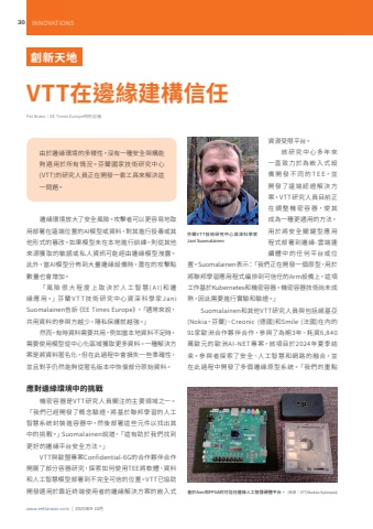www.eettaiwan.com | 2025%u5e749-10%u670830 INNOVATIONS%u5275%u65b0%u5929%u5730VTT%u5728%u908a%u7de3%u5efa%u69cb%u4fe1%u4efbPat Brans%uff0cEE Times Europe%u7279%u7d04%u8a18%u8005%u7531%u65bc%u908a%u7de3%u74b0%u5883%u7684%u591a%u6a23%u6027%uff0c%u6c92%u6709%u4e00%u7a2e%u5b89%u5168%u67b6%u69cb%u80fd%u5920%u9069%u7528%u65bc%u6240%u6709%u60c5%u6cc1%u3002%u82ac%u862d%u570b%u5bb6%u6280%u8853%u7814%u7a76%u4e2d%u5fc3(VTT)%u7684%u7814%u7a76%u4eba%u54e1%u6b63%u5728%u958b%u767c%u4e00%u5957%u5de5%u5177%u4f86%u89e3%u6c7a%u9019%u4e00%u554f%u984c%u3002%u8cc7%u6e90%u53d7%u9650%u5e73%u53f0%u3002%u8a72%u7814%u7a76%u4e2d%u5fc3%u591a%u5e74%u4f86%u4e00%u76f4%u81f4%u529b%u65bc%u70ba%u5d4c%u5165%u5f0f%u8a2d%u5099 %u958b %u767c %u4e0d %u540c %u7684 T E E%uff0c%u4e26%u958b%u767c%u4e86%u9060%u7aef%u8a8d%u8b49%u89e3%u6c7a%u65b9%u6848%u3002VTT%u7814%u7a76%u4eba%u54e1%u76ee%u524d%u6b63%u5728 %u8abf %u6574 %u6a5f %u5bc6 %u5bb9 %u5668%uff0c%u4f7f %u5176%u6210%u70ba%u4e00%u7a2e%u66f4%u901a%u7528%u7684%u65b9%u6cd5%uff0c%u7528%u65bc%u5c07%u5b89%u5168%u95dc%u9375%u578b%u61c9%u7528%u7a0b%u5f0f%u90e8%u7f72%u5230%u908a%u7de3-%u96f2%u7aef%u9023%u7e8c%u9ad4%u4e2d%u7684%u4efb%u4f55%u5e73%u53f0%u6216%u4f4d%u7f6e%u3002Suomalainen%u8868%u793a%uff1a%u300c%u6211%u5011%u6b63%u5728%u958b%u767c%u4e00%u500b%u539f%u578b%uff0c%u7528%u65bc%u5c07%u806f%u90a6%u5b78%u7fd2%u61c9%u7528%u7a0b%u5f0f%u7de8%u6392%u5230%u53ef%u4fe1%u4efb%u7684Arm%u8a2d%u5099%u4e0a%uff0c%u9019%u9805%u5de5%u4f5c%u57fa%u65bcKubernetes%u548c%u6a5f%u5bc6%u5bb9%u5668%u3002%u6a5f%u5bc6%u5bb9%u5668%u6280%u8853%u5c1a%u672a%u6210%u719f%uff0c%u56e0%u6b64%u9700%u8981%u9032%u884c%u5be6%u9a57%u548c%u9a57%u8b49%u3002%u300dSuomalainen%u548c%u5176%u4ed6VTT%u7814%u7a76%u4eba%u54e1%u8207%u5305%u62ec%u8afe%u57fa%u4e9e(Nokia%uff0c%u82ac%u862d)%u3001Creonic (%u5fb7%u570b)%u548cSmile (%u6cd5%u570b)%u5728%u5167%u768491%u5bb6%u6b50%u6d32%u5408%u4f5c%u5925%u4f34%u5408%u4f5c%uff0c%u53c3%u8207%u4e86%u70ba%u671f3%u5e74%u3001%u8017%u8cc76,840%u842c%u6b50%u5143%u7684%u6b50%u6d32AI-NET%u5c08%u6848%uff0c%u8a72%u9805%u76ee%u65bc2024%u5e74%u590f%u5b63%u7d50%u675f%u3002%u53c3%u8207 %u8005%u63a2%u7d22%u4e86%u5b89%u5168%u3001%u4eba%u5de5%u667a%u6167%u548c%u7db2%u8def%u7684%u878d%u5408%uff0c%u4e26%u5728%u6b64%u904e%u7a0b%u4e2d%u958b%u767c%u4e86%u591a%u500b%u908a%u7de3%u539f%u578b%u7cfb%u7d71%u3002%u300c%u6211%u5011%u7684%u91cd%u9ede%u82ac%u862dVTT%u6280%u8853%u7814%u7a76%u4e2d%u5fc3%u8cc7%u6df1%u79d1%u5b78%u5bb6Jani Suomalainen%u908a%u7de3%u74b0%u5883%u653e%u5927%u4e86%u5b89%u5168%u98a8%u96aa%u3002%u653b%u64ca%u8005%u53ef%u4ee5%u66f4%u5bb9%u6613%u5730%u53d6%u7528%u90e8%u7f72%u5728%u9060%u7aef%u4f4d%u7f6e%u7684AI%u6a21%u578b%u6216%u8cc7%u6599%uff0c%u5c0d%u5176%u9032%u884c%u6295%u6bd2%u6216%u5176%u4ed6%u5f62%u5f0f%u7684%u7be1%u6539%u3002%u5982%u679c%u6a21%u578b%u672a%u5728%u672c%u5730%u9032%u884c%u8a13%u7df4%uff0c%u5247%u5f9e%u5176%u4ed6%u4f86%u6e90%u7372%u53d6%u7684%u654f%u611f%u6216%u79c1%u4eba%u8cc7%u8a0a%u53ef%u80fd%u7d93%u7531%u908a%u7de3%u6a21%u578b%u6d29%u9732%u3002%u6b64%u5916%uff0c%u7576AI%u6a21%u578b%u5206%u4f48%u5230%u5927%u91cf%u908a%u7de3%u8a2d%u5099%u6642%uff0c%u6f5b%u5728%u7684%u653b%u64ca%u9ede%u6578%u91cf%u4e5f%u6703%u589e%u52a0%u3002%u300c%u98a8%u96aa%u5f88%u5927%u7a0b%u5ea6%u4e0a%u53d6%u6c7a%u65bc%u4eba%u5de5%u667a%u6167(AI)%u548c%u908a%u7de3 %u61c9 %u7528%u3002%u300d%u82ac %u862d V T T %u6280 %u8853 %u7814 %u7a76%u4e2d%u5fc3%u8cc7 %u6df1 %u79d1 %u5b78 %u5bb6 Ja n i Suomalainen%u544a%u8a34%u300aEE Times Europe%u300b%uff0c%u300c%u901a%u5e38%u4f86%u8aaa%uff0c%u5171%u7528%u8cc7%u6599%u7684%u53c3%u8207%u65b9%u8d8a%u5c11%uff0c%u96b1%u79c1%u4fdd%u8b77%u5c31%u8d8a%u5f37%u3002%u300d%u7136%u800c%uff0c%u6709%u6642%u8cc7%u6599%u9700%u8981%u5171%u7528%uff0c%u4f8b%u5982%u7576%u672c%u5730%u8cc7%u6599%u4e0d%u8db3%u6642%uff0c%u9700%u8981%u4f7f%u7528%u6a21%u578b%u5f9e%u4e2d%u5fc3%u5316%u5340%u57df%u7372%u53d6%u66f4%u591a%u8cc7%u6599%u3002%u4e00%u7a2e%u89e3%u6c7a%u65b9%u6848%u662f%u5c07%u8cc7%u6599%u533f%u540d%u5316%uff0c%u4f46%u5728%u6b64%u904e%u7a0b%u4e2d%u6703%u640d%u5931%u4e00%u4e9b%u6e96%u78ba%u6027%uff0c%u4e26%u4e14%u5c0d%u624b%u4ecd%u7136%u80fd%u5920%u5f9e%u533f%u540d%u7248%u672c%u4e2d%u6062%u5fa9%u90e8%u5206%u539f%u59cb%u8cc7%u6599%u3002%u61c9%u5c0d%u908a%u7de3%u74b0%u5883%u4e2d%u7684%u6311%u6230%u6a5f%u5bc6%u5bb9%u5668%u662fVTT%u7814%u7a76%u4eba%u54e1%u95dc%u6ce8%u7684%u4e3b%u8981%u9818%u57df%u4e4b%u4e00%u3002%u300c%u6211%u5011%u5df2%u7d93%u958b%u767c%u4e86%u6982%u5ff5%u9a57%u8b49%uff0c%u5c07%u57fa%u65bc%u806f%u90a6%u5b78%u7fd2%u7684%u4eba%u5de5%u667a%u6167%u7cfb%u7d71%u5c01%u88dd%u9032%u5bb9%u5668%u4e2d%uff0c%u7136%u5f8c%u90e8%u7f72%u9019%u4e9b%u5143%u4ef6%u4ee5%u627e%u51fa%u5176%u4e2d%u7684%u6311%u6230%u3002%u300dSuomalainen%u8aaa%u9053%uff0c%u300c%u9019%u6709%u52a9%u65bc%u6211%u5011%u627e%u5230%u66f4%u597d%u7684%u908a%u7de3%u5e73%u53f0%u5b89%u5168%u65b9%u6cd5%u3002%u300dVTT%u8207%u6b50%u76df%u5c08%u6848Confidential-6G%u7684%u5408%u4f5c%u5925%u4f34%u5408%u4f5c%u958b%u5c55%u4e86%u90e8%u5206%u5bb9%u5668%u7814%u7a76%uff0c%u63a2%u7d22%u5982%u4f55%u4f7f%u7528TEE%u5c07%u8edf%u9ad4%u3001%u8cc7%u6599%u548c%u4eba%u5de5%u667a%u6167%u6a21%u578b%u90e8%u7f72%u5230%u4e0d%u5b8c%u5168%u53ef%u4fe1%u7684%u4f4d%u7f6e%u3002VTT%u5df2%u5354%u52a9%u958b%u767c%u9069%u7528%u65bc%u9760%u8fd1%u7d42%u7aef%u4f7f%u7528%u8005%u7684%u908a%u7de3%u89e3%u6c7a%u65b9%u6848%u7684%u5d4c%u5165%u5f0f %u57fa%u65bcArm%u548cFPGA%u7684%u53ef%u4fe1%u4efb%u908a%u7de3%u4eba%u5de5%u667a%u6167%u786c%u9ad4%u5e73%u53f0%u3002 (%u4f86%u6e90%uff1aVTT/Markku Kyl%u00e4np%u00e4%u00e4)