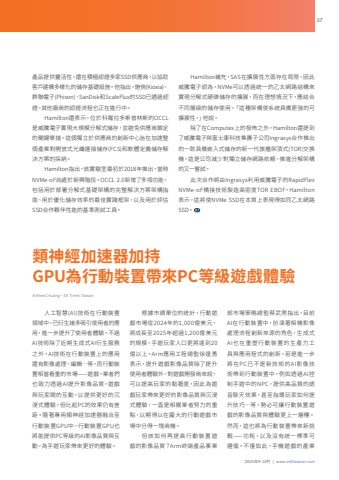 2025%u5e749-10%u6708 | www.eettaiwan.comINNOVATIONS 37%u7522%u54c1%u63d0%u4f9b%u9748%u6d3b%u6027%uff0c%u9084%u5728%u7a4d%u6975%u8a8d%u8b49%u591a%u5bb6SSD%u4f9b%u61c9%u5546%uff0c%u4ee5%u5354%u52a9%u5ba2%u6236%u5efa%u69cb%u591a%u6a23%u5316%u7684%u5132%u5b58%u57fa%u790e%u8a2d%u65bd%u3002%u4ed6%u6307%u51fa%uff0c%u93a7%u4fe0(Kioxia)%u3001%u7fa4%u806f%u96fb%u5b50(Phison)%u3001SanDisk%u548cScaleFlux%u7684SSD%u5df2%u901a%u904e%u8a8d%u8b49%uff0c%u5176%u4ed6%u5ee0%u5546%u7684%u8a8d%u8b49%u6d41%u7a0b%u4e5f%u6b63%u5728%u9032%u884c%u4e2d%u3002Hamilton%u9084%u8868%u793a%uff0c%u4f4d%u65bc%u79d1%u7f85%u62c9%u591a%u65af%u666e%u6797%u65af%u7684OCCL%u662f%u5a01%u9a30%u96fb%u5b50%u5be6%u73fe%u5927%u898f%u6a21%u5206%u89e3%u5f0f%u5132%u5b58%uff0c%u4e26%u907f%u514d%u4f9b%u61c9%u5546%u9396%u5b9a%u7684%u95dc%u9375%u8209%u63aa%u3002%u9019%u500b%u7368%u7acb%u65bc%u4f9b%u61c9%u5546%u7684%u5275%u65b0%u4e2d%u5fc3%u65e8%u5728%u52a0%u901f%u6574%u500b%u7522%u696d%u5c0d%u958b%u653e%u5f0f%u5149%u7e96%u9023%u63a5%u5132%u5b58(FCS)%u548c%u8edf%u9ad4%u5b9a%u7fa9%u5132%u5b58%u89e3%u6c7a%u65b9%u6848%u7684%u63a1%u7d0d%u3002Hamilton%u6307%u51fa%uff0c%u8a72%u5be6%u9a57%u5ba4%u6700%u521d%u65bc2018%u5e74%u63a8%u51fa%uff0c%u7576%u6642NVMe-oF%u5c1a%u8655%u65bc%u65b0%u8208%u968e%u6bb5%u3002OCCL 2.0%u65b0%u589e%u4e86%u591a%u9805%u529f%u80fd%uff0c%u5305%u62ec%u7528%u65bc%u90e8%u7f72%u5206%u89e3%u5f0f%u57fa%u790e%u67b6%u69cb%u7684%u5b8c%u6574%u89e3%u6c7a%u65b9%u6848%u67b6%u69cb%u6307%u5357%u3001%u7528%u65bc%u512a%u5316%u5132%u5b58%u6548%u7387%u7684%u6700%u4f73%u5be6%u8e10%u6846%u67b6%uff0c%u4ee5%u53ca%u7528%u65bc%u8a55%u4f30SSD%u5408%u4f5c%u5925%u4f34%u6027%u80fd%u7684%u57fa%u6e96%u6e2c%u8a66%u5de5%u5177%u3002Hamilton%u88dc%u5145%uff0cSAS%u5728%u64f4%u5c55%u6027%u65b9%u9762%u5b58%u5728%u5c40%u9650%uff0c%u56e0%u6b64%u5a01%u9a30%u96fb%u5b50%u8a8d%u70ba%uff0cNVMe%u53ef%u4ee5%u900f%u904e%u7d71%u4e00%u7684%u4e59%u592a%u7db2%u8def%u7d50%u69cb%u4f86%u5be6%u73fe%u5206%u89e3%u5f0f%u786c%u789f%u5132%u5b58%u7684%u64f4%u5c55%uff0c%u800c%u5728%u7406%u60f3%u60c5%u6cc1%u4e0b%uff0c%u61c9%u7d50%u5408%u4e0d%u540c%u5c64%u7d1a%u7684%u5132%u5b58%u4f7f%u7528%u3002%u300c%u9019%u7a2e%u67b6%u69cb%u4f7f%u7cfb%u7d71%u5177%u5099%u66f4%u5f37%u7684%u53ef%u64f4%u5c55%u6027%uff0c%u300d%u4ed6%u8aaa%u3002%u9664%u4e86%u5728Computex%u4e0a%u7684%u767c%u4f48%u4e4b%u5916%uff0cHamilton%u9084%u63d0%u5230%u4e86%u5a01%u9a30%u96fb%u5b50%u8207%u5bcc%u58eb%u5eb7%u79d1%u6280%u96c6%u5718%u5b50%u516c%u53f8Ingrasys%u5408%u4f5c%u63a8%u51fa%u7684%u4e00%u6b3e%u5177%u5099%u5d4c%u5165%u5f0f%u5132%u5b58%u7684%u65b0%u4e00%u4ee3%u65d7%u8266%u67b6%u9802%u5f0f(TOR)%u4ea4%u63db%u6a5f%uff0c%u9019%u662f%u516c%u53f8%u6e1b%u5c11%u5c0d%u7368%u7acb%u5132%u5b58%u7db2%u8def%u4f9d%u8cf4%u3001%u63a8%u9032%u5206%u89e3%u67b6%u69cb%u7684%u53c8%u4e00%u5617%u8a66%u3002%u6b64%u6b21%u5408%u4f5c%u5c07%u7531Ingrasys%u5229%u7528%u5a01%u9a30%u96fb%u5b50%u7684RapidFlex NVMe-oF%u6a4b%u63a5%u6280%u8853%u88fd%u9020%u9ad8%u5bc6%u5ea6TOR EBOF%uff0cHamilton%u8868%u793a%uff0c%u9019%u5c07%u4f7fNVMe SSD%u5728%u672c%u8cea%u4e0a%u8868%u73fe%u5f97%u5982%u540c%u4e59%u592a%u7db2%u8defSSD%u3002%u985e%u795e%u7d93%u52a0%u901f%u5668%u52a0%u6301GPU%u70ba%u884c%u52d5%u88dd%u7f6e%u5e36%u4f86PC%u7b49%u7d1a%u904a%u6232%u9ad4%u9a57Anthea Chuang%uff0cEE Times Taiwan%u4eba%u5de5%u667a%u6167(AI)%u6280%u8853%u5728%u884c%u52d5%u88dd%u7f6e%u9818%u57df%u4e2d%uff0c%u5df2%u884d%u751f%u8af8%u591a%u5438%u5f15%u4f7f%u7528%u8005%u7684%u61c9%u7528%uff0c%u9032%u4e00%u6b65%u63d0%u5347%u4e86%u4f7f%u7528%u8005%u9ad4%u9a57%u3002%u4e0d%u904eAI%u6280%u8853%u9664%u4e86%u8fd1%u671f%u751f%u6210%u5f0fAI%u884d%u751f%u670d%u52d9%u4e4b%u5916%uff0cAI%u6280%u8853%u5728%u884c%u52d5%u88dd%u7f6e%u4e0a%u7684%u61c9%u7528%u9084%u6709%u5f71%u50cf%u8655%u7406%u3001%u7de8%u8f2f%u2026%u7b49%uff0c%u800c%u884c%u52d5%u88dd%u7f6e%u76f8%u7576%u770b%u91cd%u7684%u5e02%u5834%u2014%u2014%u904a%u6232%uff0c%u696d%u8005%u5011%u4e5f%u81f4%u529b%u900f%u904eAI%u63d0%u5347%u5f71%u50cf%u54c1%u8cea%uff0c%u904a%u6232%u8207%u73a9%u5bb6%u9593%u7684%u4e92%u52d5%uff0c%u4ee5%u63d0%u4f9b%u66f4%u597d%u7684%u6c89%u6d78%u5f0f%u9ad4%u9a57%uff0c%u4f46%u6bd4%u8d77PC%u7684%u6548%u679c%u4ecd%u6709%u5dee%u8ddd%u3002%u96a8%u8457%u5c08%u7528%u985e%u795e%u7d93%u52a0%u901f%u5668%u878d%u5408%u81f3%u884c%u52d5%u88dd%u7f6eGPU%u4e2d%uff0c%u884c%u52d5%u88dd%u7f6eGPU%u4e5f%u5c07%u80fd%u63d0%u4f9bPC%u7b49%u7d1a%u7684AI%u5f71%u50cf%u54c1%u8cea%u8207%u4e92%u52d5%uff0c%u70ba%u624b%u904a%u73a9%u5bb6%u5e36%u4f86%u66f4%u597d%u7684%u9ad4%u9a57%u3002%u6839%u64da%u5e02%u8abf%u55ae%u4f4d%u7684%u7d71%u8a08%uff0c%u884c%u52d5%u904a%u6232%u5e02%u5834%u5f9e2024%u5e74%u76841,000%u5104%u7f8e%u5143%uff0c%u5c07%u6210%u9577%u81f32025%u5e74%u8d85%u904e1,200%u5104%u7f8e%u5143%u7684%u898f%u6a21%uff0c%u624b%u904a%u73a9%u5bb6%u4eba%u53e3%u66f4%u5c07%u9054%u523020%u5104%u4ee5%u4e0a%u3002Arm%u61c9%u7528%u5de5%u7a0b%u7e3d%u76e3%u5f90%u9054%u52c7%u8868%u793a%uff0c%u63d0%u5347%u904a%u6232%u5f71%u50cf%u54c1%u8cea%u9664%u4e86%u63d0%u5347%u4f7f%u7528%u8005%u9ad4%u9a57%u5916%uff0c%u5c0d%u904a%u6232%u958b%u767c%u5546%u4f86%u8aaa%uff0c%u53ef%u4ee5%u63d0%u9ad8%u73a9%u5bb6%u7684%u9ecf%u8457%u5ea6%uff0c%u56e0%u6b64%u70ba%u904a%u6232%u73a9%u5bb6%u5e36%u4f86%u66f4%u597d%u7684%u5f71%u50cf%u54c1%u8cea%u8207%u6c89%u6d78%u5f0f%u9ad4%u9a57%uff0c%u4e00%u76f4%u662f%u76f8%u95dc%u696d%u8005%u52aa%u529b%u7684%u91cd%u9ede%uff0c%u4ee5%u671f%u5f97%u4ee5%u5728%u9f90%u5927%u7684%u884c%u52d5%u904a%u6232%u5e02%u5834%u4e2d%u5206%u5f97%u4e00%u584a%u5546%u6a5f%u3002%u4f46%u8a72%u5982%u4f55%u518d%u63d0%u9ad8%u884c%u52d5%u88dd%u7f6e%u904a%u6232%u7684%u5f71%u50cf%u54c1%u8cea%uff1fArm%u7d42%u7aef%u7522%u54c1%u4e8b%u696d%u90e8%u5e02%u5834%u7b56%u7565%u7e3d%u76e3%u8521%u6b66%u7537%u6307%u51fa%uff0c%u76ee%u524dAI%u5728%u884c%u52d5%u88dd%u7f6e%u4e2d%uff0c%u626e%u6f14%u8457%u76f8%u6a5f%u5f71%u50cf%u8655%u7406%u6d41%u7a0b%u5275%u65b0%u4f86%u6e90%u7684%u89d2%u8272%uff0c%u751f%u6210%u5f0fAI%u4e5f%u5728%u91cd%u5851%u884c%u52d5%u88dd%u7f6e%u7684%u751f%u7522%u529b%u5de5%u5177%u8207%u61c9%u7528%u7a0b%u