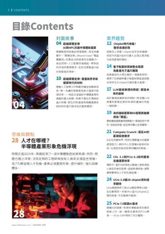 www.eettaiwan.com | 2025%u5e749-10%u67082 CONTENTS%u696d%u754c%u8da8%u52e212 Chiplet%u6642%u4ee3%u4f86%u81e8%uff01%u0009 %u6574%u4f75%u6d6a%u6f6e%u521d%u73fe%u5f9e%u6982%u5ff5%u4e0a%u4f86%u770b%uff0cchiplet%u4e26%u975e%u5168%u65b0%u8b70%u984c%uff0c%u4f46%u5982%u4eca%u7684%u6676%u7247%u8a2d%u8a08%u5df2%u9081%u5165%u5fc5%u9808%u4ee5%u66f4%u6d41%u7a0b%u5316%u9014%u5f91%u8655%u7406%u7684%u968e%u6bb5%u202614 %u91cf%u5b50%u9ede%u96f7%u5c04%u7a81%u7834%u6574%u5408%u74f6%u9838%u70ba%u91cf%u7522%u5149%u5b50%u6676%u7247%u92ea%u8def%u7531%u7f8e%u570b%u52a0%u5dde%u5927%u5b78%u4e3b%u5c0e%u7684%u4e00%u9805%u6700%u65b0%u7814%u7a76%uff0c%u5c55%u73fe%u4e86%u5728%u5c07%u92a6%u7837%u91cf%u5b50%u9ede%u96f7%u5c04%u55ae%u6676%u76f4%u63a5%u6574%u5408%u81f3%u77fd%u5149%u5b50chiplet%u65b9%u9762%u7684%u91cd%u5927%u9032%u5c55%u202617 LLM%u908a%u7de3%u63a8%u7406%u7684%u8208%u8d77%uff1a%u5851%u9020%u672a%u4f86%u7684%u5275%u65b0%u7531%u65bc%u908a%u7de3%u8a2d%u5099%u65e2%u6709%u7684%u9650%u5236%uff0c%u5c07%u5404%u7a2eLLM%u90e8%u7f72%u5230%u66f4%u9760%u8fd1%u8cc7%u6599%u4f86%u6e90%u7684%u908a%u7de3%u4ecd%u7136%u662f%u4e00%u500b%u6311%u6230%u202619 %u70ba%u4f55%u908a%u7de3%u904b%u7b97%u548c6G%u667a%u6167%u5c07%u7e7c%u7e8c%u6210%u70ba%u300c%u9858%u671b%u300d%u8981%u4f7f%u908a%u7de3%u904b%u7b97%u7372%u5f97%u767c%u5c55%u52d5%u529b%uff0c%u9700%u6eff%u8db3%u82e5%u5e72%u689d%u4ef6%uff0c%u4f46%u76ee%u524d%u4f86%u770b%uff0c%u9019%u4e9b%u689d%u4ef6%u96e3%u4ee5%u5168%u90e8%u5be6%u73fe%u202621 Compute Crunch%uff1a%u6eff%u8db3AI%u7684%u57fa%u790e%u8a2d%u65bd%u9700%u6c42AI%u6b63%u5728%u6539%u8b8a%u4e16%u754c%uff0c%u7136%u800c%u5b83%u9700%u8981%u9f90%u5927%u7684%u904b%u7b97%u8655%u7406%u80fd%u529b%u3002%u8cc7%u6599%u4e2d%u5fc3%u652f%u6490%u8457AI%u5275%u65b0%u7684%u672a%u4f86%uff0c%u4e5f%u4f7f%u5176%u6548%u80fd%u6210%u70ba%u773e%u6240%u77da%u76ee%u7684%u7126%u9ede%u202622 CXL 3.1%u548cPCIe 6.2%u5982%u4f55%u91cd%u65b0%u5b9a%u7fa9%u904b%u7b97%u6548%u7387%u96fb%u5f71%u4e2d%uff0c%u57fa%u65bcAI%u7684%u89d2%u8272%u4ee5%u6a5f%u5668%u4eba%u7ba1%u5bb6%u6216%u8cbc%u5fc3%u670b%u53cb%u7684%u8eab%u4efd%u767b%u5834%u3002%u9019%u80a1%u71b1%u6f6e%u80cc%u5f8c%uff0c%u51dd%u805a%u8457%u7121%u6578%u5091%u51fa%u4eba%u624d%u548c%u5148%u9032%u8a2d%u5099%u202624 UCIe 3.0%u8b932D chiplet%u8cc7%u6599%u901f%u7387%u7ffb%u500dUCIe%u806f%u76df%u767c%u4f48%u4e86%u5176UCIe%u958b%u653e%u6a19%u6e963.0%u7248%uff0c%u65e8%u5728%u5be6%u73fe%u540c%u4e00%u5c01%u88dd%u5167%u5c0f%u6676%u7247(chiplet)%u4e4b%u9593%u7684%u9ad8%u901f%u3001%u53ef%u4e92%u52d5%u64cd%u4f5c%u9023%u63a5%u202625 PCIe 7.0%u7dca%u8ddfAI%u9700%u6c42%u96a8%u8457AI%u7684%u767c%u5c55%uff0c%u5c0d%u8cc7%u6599%u50b3%u8f38%u901f%u7387%u7684%u9700%u6c42%u6025%u5287%u4e0a%u5347%u3002%u9019%u4e00%u8da8%u52e2%u5728%u6700%u65b0%u7684PCIe%u6a19%u6e96%u2014%u2014PCIe 7.0%u4e2d%u5f97%u5230%u4e86%u5145%u5206%u9ad4%u73fe%u2026%u6642%u9593%u6b63%u503c2025%u5e74%uff0c%u7f8e%u570b%u8fce%u4f86%u4e86%u4e00%u6ce2%u534a%u5c0e%u9ad4%u88fd%u9020%u6295%u8cc7%u71b1%u6f6e%uff0c%u7136%u800c%uff0c%u554f%u984c%u4e5f%u96a8%u4e4b%u6d6e%u73fe%uff1a%u6c92%u6709%u8db3%u5920%u7684%u5de5%u7a0b%u5e2b%u8207%u6280%u8853%u4eba%u54e1%u4f86%u652f%u6490%u9019%u4e9b%u767c%u5c55%u3002%u70ba%u4e86%u5316%u89e3%u9019%u5834%u4eba%u624d%u5371%u6a5f%uff0c%u7522%u696d%u5fc5%u9808%u91cd%u5851%u5f62%u8c61%u3001%u63d0%u5347%u798f%u5229%u3001%u5f37%u5316%u8a13%u7df4%u9ad4%u7cfb%u2026%u601d%u7dad%u8207%u89c0%u9ede28 %u4eba%u624d%u5728%u54ea%u88e1%uff1f%u0009 %u534a%u5c0e%u9ad4%u7522%u696d%u5f62%u8c61%u5371%u6a5f%u6d6e%u73fe%u5c01%u9762%u6545%u4e8b04 %u8d85%u8d8a%u6469%u723e%u5b9a%u5f8b%u3000%u0009 AI%u8207HPC%u5171%u8b5c%u534a%u5c0e%u9ad4%u65b0%u7bc7%u7ae0%u96a8%u8457%u88fd%u7a0b%u6280%u8853%u903c%u8fd1%u7269%u7406%u6975%u9650%u3001%u6210%u672c%u6301%u7e8c%u6500%u5347%uff0c%u300c%u6469%u723e%u5b9a%u5f8b%u300d(Moore's law)%u300c%u96fb%u6676%u9ad4%u7ffb%u500d%u300d%u7684%u9ec3%u91d1%u6cd5%u5247%u9010%u6f38%u5931%u53bb%u9a45%u52d5%u529b%u3002%u8207%u6b64%u540c%u6642%uff0c%u4eba%u5de5%u667a%u6167%u5feb%u901f%u5d1b%u8d77%uff0c%u5e36%u4f86%u524d%u6240%u672a%u6709%u7684%u904b%u7b97%u9700%u6c42%uff0c%u4e26%u53cd%u5411%u63a8%u52d5%u6676%u7247%u8a2d%u8a08%u8207%u88fd%u9020%u7684%u9769%u65b0%u300210 %u8d85%u8d8a%u6469%u723e%u5b9a%u5f8b%uff1a%u9700%u91cd%u65b0%u601d%u8003%u65b0%u904b%u7b97%u6642%u4ee3%u7684%u6750%u6599%u96a8%u8457%u4eba%u5de5%u667a%u6167%u5de5%u4f5c%u8ca0%u8f09%u6301%u7e8c%u5448%u6307%u6578%u7d1a%u6210%u9577%uff0c%u552f%u4e00%u6c38%u7e8c%u7684%u767c%u5c55%u8def%u5f91%u662f%u5927%u5e45%u63d0%u5347%u80fd%u6e90%u6548%u7387%u2014%u2014%u800c%u9019%u6b63%u662f%u7576%u524d%u534a%u5c0e%u9ad4%u7522%u696d%u6240%u9762%u81e8%u7684%u91cd%u5927%u6311%u6230%u3002%u7b54%u6848%u4e0d%u50c5%u5728%u65bc%u50b3%u7d71%u7684%u6676%u7247%u67b6%u69cb%uff0c%u66f4%u5728%u65bc%u5c0d%u9023%u63a5%u548c%u9694%u96e2%u904b%u7b97%u7cfb%u7d71%u7684%u6750%u6599%u9032%u884c%u6839%u672c%u6027%u7684%u91cd%u65b0%u69cb%u60f3%u3002%u76ee%u9304Contents0428