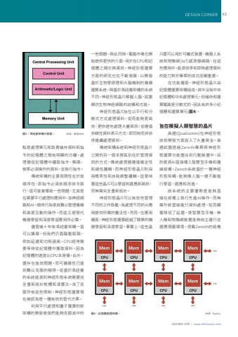 2025%u5e749-10%u6708 | www.eettaiwan.comDESIGN CORNER 43%u9ede%u662f%u8655%u7406%u55ae%u5143%u548c%u8ca0%u8cac%u5132%u5b58%u8cc7%u6599%u548c%u6307%u4ee4%u7684%u8a18%u61b6%u9ad4%u4e4b%u9593%u6709%u660e%u986f%u7684%u5206%u96e2%u3002%u8655%u7406%u5668%u5f9e%u8a18%u61b6%u9ad4%u4e2d%u8b80%u53d6%u6307%u4ee4%u3001%u89e3%u78bc%u3001%u6aa2%u7d22%u5fc5%u9808%u64cd%u4f5c%u7684%u8cc7%u6599%uff0c%u4e26%u57f7%u884c%u6307%u4ee4%u3002%u50b3%u7d71%u67b6%u69cb%u7684%u4e3b%u8981%u5c40%u9650%u6027%u5728%u65bc%u5176%u9806%u5e8f%u6027%uff0c%u5373%u6307%u4ee4%u5fc5%u9808%u4f9d%u9806%u5e8f%u4f9d%u6b21%u57f7%u884c%uff0c%u9019%u53ef%u80fd%u6703%u5c0e%u81f4%u4e00%u4e9b%u554f%u984c%uff0c%u5c24%u5176%u662f%u5728%u9700%u8981%u5e73%u884c%u8655%u7406%u7684%u61c9%u7528%u4e2d%uff0c%u5982%u795e%u7d93%u7db2%u8def%u548cAI%u3002%u9806%u5e8f%u884c%u70ba%u4f7f%u5176%u96e3%u4ee5%u7ba1%u7406%u8907%u96dc%u548c%u9ad8%u5ea6%u4e92%u52d5%u7684%u64cd%u4f5c%uff0c%u800c%u9019%u6b63%u662f%u73fe%u4ee3%u6a5f%u5668%u5b78%u7fd2%u548c%u6df1%u5ea6%u5b78%u7fd2%u61c9%u7528%u6240%u5fc5%u9700%u3002%u5118%u7ba1%u5e7e%u5341%u5e74%u4f86%u99ae%u7d10%u66fc%u67b6%u69cb%u4e00%u76f4%u53ef%u4ee5%u64f4%u5c55%uff0c%u4f46%u6211%u5011%u4ecd%u9762%u81e8%u8457%u74f6%u9838%uff0c%u4f8b%u5982%u5ef6%u9072%u548c%u529f%u8017%u904e%u9ad8%u3002CPU%u7d93%u5e38%u9700%u8981%u7b49%u5f85%u5f9e%u8a18%u61b6%u9ad4%u4e2d%u7372%u53d6%u8cc7%u6599%uff0c%u56e0%u70ba%u8a18%u61b6%u9ad4%u7684%u901f%u5ea6%u6bd4CPU%u672c%u8eab%u6162%u3002%u6b64%u5916%uff0c%u9084%u5b58%u5728%u80fd%u6548%u554f%u984c%uff0c%u800c%u53ef%u64f4%u5c55%u6027%u5df2%u9054%u5230%u96e3%u4ee5%u514b%u670d%u7684%u6975%u9650%u3002%u5f9e%u57fa%u65bc%u99ae%u7d10%u66fc%u7684%u7cfb%u7d71%u904e%u6e21%u5230%u795e%u7d93%u5f62%u614b%u7cfb%u7d71%u9700%u8981%u5b8c%u5168%u91cd%u65b0%u8a2d%u8a08%u8edf%u9ad4%u548c%u6f14%u7b97%u6cd5%u3002%u70ba%u4e86%u514b%u670d%u6240%u6709%u9019%u4e9b%u9650%u5236%uff0c%u795e%u7d93%u5f62%u614b%u904b%u7b97%u73fe%u5728%u88ab%u8a8d%u70ba%u662f%u4e00%u7a2e%u6709%u6548%u7684%u66ff%u4ee3%u65b9%u6848%u3002%u5229%u7528%u5e73%u884c%u8655%u7406%u548c%u91cf%u5b50%u904b%u7b97%u7684%u65b0%u67b6%u69cb%u7684%u958b%u767c%u4f7f%u6211%u5011%u80fd%u5920%u514b%u670d%u5176%u4e2d%u7684%u4e00%u4e9b%u554f%u984c%u3002%u8207%u6b64%u540c%u6642%uff0c%u96fb%u8166%u5e02%u5834%u4e5f%u958b%u59cb%u63d0%u4f9b%u66f4%u5feb%u7684%u4ecb%u9762%uff0c%u7528%u65bc%u5728CPU%u548c%u8a18%u61b6%u9ad4%u4e4b%u9593%u4ea4%u63db%u8cc7%u8a0a%u3002%u795e%u7d93%u5f62%u614b%u904b%u7b97%u65b9%u9762%u7684%u7814%u7a76%u4e5f%u5728%u4e0d%u65b7%u767c%u5c55%uff0c%u4ee5%u958b%u767c%u57fa%u65bc%u751f%u7269%u5b78%u539f%u7406%u548c%u5927%u8166%u6a5f%u5236%u7684%u8907%u96dc%u904b%u7b97%u7cfb%u7d71%u3002%u8207%u57fa%u65bc%u99ae%u7d10%u66fc%u67b6%u69cb%u7684%u7cfb%u7d71%u4e0d%u540c%uff0c%u795e%u7d93%u5f62%u614b%u6676%u7247%u6a21%u64ec%u4eba%u8166%uff0c%u8a66%u5716%u6a21%u4eff%u751f%u7269%u795e%u7d93%u7db2%u8def%u7684%u7d50%u69cb%u548c%u529f%u80fd%u3002%u795e%u7d93%u5f62%u614b%u6676%u7247%u65e8%u5728%u4ee5%u5e73%u884c%u548c%u5206%u6563%u5f0f%u65b9%u5f0f%u8655%u7406%u8cc7%u6599%uff0c%u5f9e%u800c%u80fd%u5920%u66f4%u9ad8%u6548%u3001%u66f4%u5feb%u901f%u5730%u8655%u7406%u5927%u91cf%u8cc7%u8a0a%uff0c%u4e26%u9075%u5faa%u975e%u7dda%u6027%u8cc7%u6599%u8868%u793a%u65b9%u5f0f%uff0c%u5373%u540c%u6642%u800c%u975e%u4f9d%u5e8f%u9023%u7e8c%u8655%u7406%u8cc7%u8a0a%u3002%u50b3%u7d71%u67b6%u69cb%u7cfb%u7d71%u548c%u795e%u7d93%u5f62%u614b%u6676%u7247%u4e4b%u9593%u7684%u53e6%u4e00%u500b%u672c%u8cea%u5340%u5225%u5728%u65bc%u7ba1%u7406%u8cc7%u8a0a%u7684%u65b9%u5f0f%u3002%u50b3%u7d71%u8655%u7406%u5668%u9075%u5faa%u78ba%u5b9a%u6027%u548c%u7dda%u6027%u908f%u8f2f%uff0c%u800c%u795e%u7d93%u5f62%u614b%u6676%u7247%u5247%u63a1%u7528%u6982%u7387%u6027%u548c%u81ea%u6211%u8abf%u6574%u908f%u8f2f%u3002%u9019%u610f%u5473%u8457%u9019%u4e9b%u6676%u7247%u53ef%u4ee5%u5b78%u7fd2%u548c%u9069%u61c9%u65b0%u8cc7%u8a0a%uff0c%u800c%u7121%u9700%u5b8c%u5168%u91cd%u65b0%u8a2d%u8a08%u3002%u795e%u7d93%u5f62%u614b%u6676%u7247%u53ef%u4ee5%u6709%u6548%u5730%u7ba1%u7406%u4e0d%u540c%u7684%u5de5%u4f5c%u8ca0%u8f09%uff0c%u70ba%u8655%u7406%u4e0d%u540c%u7684AI%u61c9%u7528%u63d0%u4f9b%u6240%u9700%u7684%u9748%u6d3b%u6027%u3002%u7136%u800c%uff0c%u5728%u61c9%u7528%u5c64%u9762%uff0c%u795e%u7d93%u5f62%u614b%u904b%u7b97%u8d85%u8d8a%u4e86%u7c21%u55ae%u7684%u6a5f%u5668%u5b78%u7fd2%u548c%u6df1%u5ea6%u5b78%u7fd2%u3002%u4e8b%u5be6%u4e0a%uff0c%u9019%u4e9b%u6676%u7247%u9084%u53ef%u4ee5%u7528%u65bc%u53ef%u651c%u5f0f%u88dd%u7f6e%u3001%u6a5f%u5668%u4eba%u7cfb%u7d71%u548c%u7269%u806f%u7db2(IoT)%u611f%u6e2c%u5668%u7db2%u8def%uff0c%u5728%u9019%u4e9b%u61c9%u7528%u4e2d%uff0c%u80fd%u6e90%u6548%u7387%u548c%u5373%u6642%u8655%u7406%u8cc7%u6599%u7684%u80fd%u529b%u5c0d%u65bc%u5c08%u6848%u7684%u6210%u529f%u81f3%u95dc%u91cd%u8981%u3002%u5728%u529f%u80fd%u5c64%u9762%uff0c%u795e%u7d93%u5f62%u614b%u6676%u7247%u7531%u8a18%u61b6%u9ad4%u904b%u7b97%u67b6%u69cb%u7d44%u6210%uff0c%u5176%u4e2d%u6c92%u6709%u4e2d%u592e%u8a18%u61b6%u9ad4%u548c%u4e2d%u592e%u8655%u7406%u55ae%u5143%uff0c%u4f46%u5132%u5b58%u548c%u904b%u7b97%u96fb%u8def%u662f%u5206%u6563%u5f0f%u7684%uff0c%u56e0%u6b64%u6709%u8a31%u591a%u5c0f%u8a18%u61b6%u9ad4%u548c%u904b%u7b97%u55ae%u5143(%u57164)%u3002%u65e8%u5728%u6a21%u64ec%u4eba%u985e%u667a%u6167%u7684%u6676%u7247%u9ad8%u901a(Qualcomm)%u5728%u795e%u7d93%u5f62%u614b%u6280%u8853%u958b%u767c%u65b9%u9762%u6295%u5165%u4e86%u5927%u91cf%u8cc7%u91d1%u3002%u9ad8%u901a%u8a66%u5716%u900f%u904eZeroth%u5c08%u6848%u5c07%u795e%u7d93%u5f62%u614b%u904b%u7b97%u529f%u80fd%u6574%u5408%u5230%u884c%u52d5%u88dd%u7f6e%u4e2d%uff0c%u76ee%u7684%u662f%u5c07AI%u76f4%u63a5%u5c0e%u5165%u667a%u6167%u578b%u624b%u6a5f%u548c%u908a%u7de3%u8a2d%u5099%u3002Zeroth%u7cfb%u7d71%u57fa%u65bc%u4e00%u7a2e%u795e%u7d93%u5f62%u614b%u67b6%u69cb%uff0c%u80fd%u5920%u50cf%u4eba%u8166%u4e00%u6a23%u4e0d%u65b7%u9032%u884c%u5b78%u7fd2%u3001%u9069%u61c9%u548c%u6539%u9032%u3002%u8a72%u7cfb%u7d71%u7684%u4e3b%u8981%u512a%u52e2%u662f%u80fd%u5920%u76f4%u63a5%u5728%u8a2d%u5099%u4e0a%u57f7%u884c%u5148%u9032AI%u64cd%u4f5c%uff0