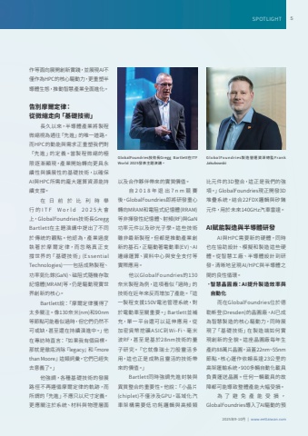 2025%u5e749-10%u6708 | www.eettaiwan.comSPOTLIGHT 5%u4f5c%u7b49%u9762%u5411%u5c55%u958b%u5275%u65b0%u5be6%u8e10%uff0c%u4e26%u5c55%u73feAI%u4e0d%u50c5%u4f5c%u70baHPC%u7684%u6838%u5fc3%u9a45%u52d5%u529b%uff0c%u66f4%u91cd%u5851%u534a%u5c0e%u9ad4%u751f%u614b%uff0c%u63a8%u52d5%u667a%u6167%u7522%u696d%u5168%u9762%u9032%u5316%u3002%u544a%u5225%u6469%u723e%u5b9a%u5f8b%uff1a%u5f9e%u5fae%u7e2e%u8d70%u5411%u300c%u57fa%u790e%u6280%u8853%u300d%u9577%u4e45%u4ee5%u4f86%uff0c%u534a%u5c0e%u9ad4%u7522%u696d%u5c07%u88fd%u7a0b%u5fae%u7e2e%u8996%u70ba%u901a%u5f80%u300c%u5148%u9032%u300d%u7684%u552f%u4e00%u9053%u8def%uff0c%u800cHPC%u7684%u52d5%u80fd%u8207%u9700%u6c42%u6b63%u91cd%u5851%u6211%u5011%u5c0d%u300c%u5148%u9032%u300d%u7684%u5b9a%u7fa9%u3002%u7576%u88fd%u7a0b%u5fae%u7e2e%u7684%u6975%u9650%u9010%u6f38%u986f%u73fe%uff0c%u7522%u696d%u958b%u59cb%u8f49%u5411%u66f4%u5177%u6c38%u7e8c%u6027%u8207%u64f4%u5c55%u6027%u7684%u57fa%u790e%u6280%u8853%uff0c%u4ee5%u78ba%u4fddAI%u8207HPC%u6240%u9700%u7684%u9f90%u5927%u904b%u7b97%u8cc7%u6e90%u80fd%u6301%u7e8c%u652f%u6490%u3002%u5728%u65e5%u524d%u65bc%u6bd4%u5229%u6642%u8209%u884c%u7684ITF World 2025%u5927%u6703%u4e0a%uff0cGlobalFoundries%u6280%u8853%u9577Gregg Bartlett%u5728%u4e3b%u984c%u6f14%u8b1b%u4e2d%u63d0%u51fa%u4e86%u4e0d%u540c%u65bc%u50b3%u7d71%u7684%u89c0%u9ede%u3002%u4ed6%u8a8d%u70ba%uff0c%u7522%u696d%u904e%u5ea6%u57f7 %u8457 %u65bc %u6469 %u723e %u5b9a %u5f8b%uff0c%u800c %u5ffd %u7565 %u771f %u6b63 %u652f%u6490%u4e16%u754c%u7684%u300c%u57fa %u790e%u6280%u8853%u300d(Essential Technologies)%u2014%u2014%u5305%u62ec%u6210%u719f%u88fd%u7a0b%u3001%u529f%u7387%u6c2e%u5316%u93b5(GaN)%u3001%u78c1%u963b%u5f0f%u96a8%u6a5f%u5b58%u53d6%u8a18%u61b6%u9ad4(MRAM)%u7b49%uff0c%u4ecd%u662f%u9a45%u52d5%u73fe%u5be6%u4e16%u754c%u5275%u65b0%u7684%u6838%u5fc3%u3002Bartlett%u8aaa%uff1a%u300c%u6469%u723e%u5b9a%u5f8b%u7372%u5f97%u4e86%u592a%u591a%u95dc%u6ce8%u3002%u50cf130%u5948%u7c73(nm)%u548c90nm%u7b49%u7bc0%u9ede%u53ef%u80fd%u770b%u4f3c%u904e%u6642%uff0c%u4f46%u5b83%u5011%u4ecd%u7136%u4e0d%u53ef%u6216%u7f3a%uff0c%u751a%u81f3%u9084%u5728%u6301%u7e8c%u6f14%u9032%u4e2d%u3002%u300d%u4ed6%u5728%u5c08%u8a2a%u6642%u76f4%u8a00%uff1a%u300c%u5982%u679c%u6211%u6709%u500b%u76ee%u6a19%uff0c%u90a3%u5c31%u662f%u5fb9%u5e95%u6d88%u9664%u300elegacy%u300f%u548c%u300emore than Moore%u300f%u9019%u985e%u8a5e%u5f59%uff0c%u5b83%u5011%u5df2%u7d93%u5931%u53bb%u610f%u7fa9%u4e86%u3002%u300d%u4ed6%u5f37%u8abf%uff0c%u5404%u7a2e%u57fa%u790e%u6280%u8853%u7684%u767c%u5c55%u8def%u5f91%u4e0d%u518d%u9075%u5faa%u6469%u723e%u5b9a%u5f8b%u7684%u8ecc%u8de1%uff0c%u800c%u6240%u8b02%u7684%u300c%u5148%u9032%u300d%u4e0d%u61c9%u53ea%u4ee5%u5c3a%u5bf8%u5b9a%u7fa9%uff0c%u66f4%u61c9%u95dc%u6ce8%u65bc%u7cfb%u7d71%u3001%u6750%u6599%u8207%u7269%u7406%u5c64%u9762%u4ee5%u53ca%u5408%u4f5c%u5925%u4f34%u5e36%u4f86%u7684%u5be6%u8cea%u50f9%u503c%u3002%u81ea2018%u5e74%u9000%u51fa7nm%u7af6%u8cfd%u5f8c%uff0cGlobalFoundries%u5373%u5c07%u7814%u767c%u91cd%u5fc3%u8f49%u5411MRAM%u548c%u96fb%u963b%u5f0f%u8a18%u61b6%u9ad4(RRAM)%u7b49%u975e%u63ee%u767c%u6027%u8a18%u61b6%u9ad4%u3001%u5c04%u983b(RF)%u8207GaN%u529f%u7387%u5143%u4ef6%u4ee5%u53ca%u77fd%u5149%u5b50%u5b78%u3002%u9019%u4e9b%u6280%u8853%u96d6%u975e%u6700%u65b0%u88fd%u7a0b%uff0c%u4f46%u90fd%u662f%u63a8%u52d5%u7522%u696d%u5275%u65b0%u7684%u57fa%u77f3%uff0c%u6b63%u9a45%u52d5%u8457%u96fb%u52d5%u8eca(EV)%u3001AI%u908a%u7de3%u904b%u7b97%u3001%u8cc7%u6599%u4e2d%u5fc3%u8207%u5b89%u5168%u652f%u4ed8%u7b49%u5be6%u969b%u61c9%u7528%u3002%u4ed6%u4ee5GlobalFoundries%u7684130%u5948%u7c73%u88fd%u7a0b%u70ba%u4f8b%uff0c%u9019%u9805%u770b%u4f3c%u300c%u904e%u6642%u300d%u7684%u6280%u8853%u5728%u8fd1%u5e74%u4f86%u53cd%u800c%u589e%u52a0%u4e86%u7522%u80fd%u3002%u300c%u9019%u4e00%u88fd%u7a0b%u652f%u63f4150V%u96fb%u6c60%u7ba1%u7406%u7cfb%u7d71%uff0c%u5c0d%u65bc%u96fb%u52d5%u8eca%u81f3%u95dc%u91cd%u8981%u3002%u300dBartlett%u4e26%u88dc%u5145%uff0c%u55ae%u4e00%u5e73%u53f0%u9084%u53ef%u4ee5 %u5ef6%u4f38%u61c9%u7528%uff0c%u5f9e%u52a0%u5bc6%u8ca8%u5e63%u6316%u7926ASIC%u5230Wi-Fi%u3001%u6beb%u7c73%u6ce2RF%uff0c%u751a%u81f3%u662f%u57fa%u65bc28nm%u6280%u8853%u7684%u91cf%u5b50%u7814%u7a76%u3002%u300c%u5b83%u5c31%u50cf%u745e%u58eb%u5200%u822c%u9748%u6d3b%u591a%u7528%uff0c%u9019%u4e5f%u6b63%u662f%u6210%u719f%u4e14%u9748%u6d3b%u7684%u6280%u8853%u5e36%u4f86%u7684%u50f9%u503c%u3002%u300dBartlett%u540c%u6642%u5f37%u8abf%u5148%u9032%u5c01%u88dd%u8207%u7570%u8cea%u6574%u5408%u7684%u91cd%u8981%u6027%u3002%u4ed6%u8aaa%uff1a%u300c%u5c0f%u6676%u7247(chiplet)%u4e0d%u50c5%u6d89%u53caGPU%uff0c%u5340%u57df%u5316%u6c7d%u8eca%u67b6%u69cb%u9700%u8981%u4f4e%u529f%u8017%u908f%u8f2f%u8207%u9ad8%u983b%u985e%u6bd4%u5143%u4ef6%u76843D%u6574%u5408%uff0c%u9019%u6b63%u662f%u6211%u5011%u7684%u5f37%u9805%u3002%u300dGlobalFoundries%u73fe%u6b63%u958b%u767c3D%u5806%u758a%u7cfb%u7d71%uff0c%u7d50%u540822FDX%u908f%u8f2f%u8207%u77fd%u937a%u5143%u4ef6%uff0c%u7528%u65bc%u672a%u4f86140GHz%u6c7d%u8eca%u96f7%u9054%u3002AI%u8ce6%u80fd%u88fd%u9020%u8207%u534a%u5c0e%u9ad4%u7814%u767cAI%u8207HPC%u9700%u8981%u65b0%u7684%u786c%u9ad4%uff0c%u540c%u6642%u4e5f%u5728%u5354%u52a9%u8a2d%u8a08%u3001%u6a21%u64ec%u548c%u88fd%u9020%u9019%u4e9b%u786c%u9ad4%u3002%u5f9e%u667a%u6167%u5de5%u5ee0%u3001%u534a%u5c0e%u9ad4%u8a2d%u8a08%u5230%u7814%u767c%uff0c%u6e05%u6670%u5730%u5448%u73feAI/HPC%u8207%u534a%u5c0e%u9ad4%u4e4b%u9593%u7684%u826f%u6027%u5faa%u74b0%u3002%uff0e%u0007%u667a%u6167%u6676%u5713%u5ee0%uff1aAI%u63d0%u5347%u88fd%u9020%u6548%u7387%u8207%u81ea%u52d5%u5316%u800c%u5728GlobalFoundries%u4f4d%u65bc%u5fb7%u52d2%u65af%u767b(Dresden)%u7684%u6676%u5713%u5ee0%uff0cAI%u5df2%u6210%u70ba%u667a%u6167%u88fd%u9020%u7684%u6838%u5fc3%u9a45%u52d5%u529b%uff0c%u540c%u6642%u5c55%u73fe%u4e86%u300c%u57fa%u790e%u6280%u8853%u300d%u5728%u88fd%u9020%u7aef%u5982%u4f55%u5be6%u73fe%u5275%u65b0%u7684%u5168%u8c8c%u3002%u9019%u5ea7%u6676%u5713%u5ee0%u6bcf%u5e74%u751f%u7522%u7d0488%u842c%u7247%u6676%u5713%uff0c%u6db5%u84cb22nm~55nm%u7bc0%u9ede%uff0c%u6838%u5fc3%u904b%u4f5c%u4f9d%u8cf4%u9577%u905423%u516c%u91cc%u7684%